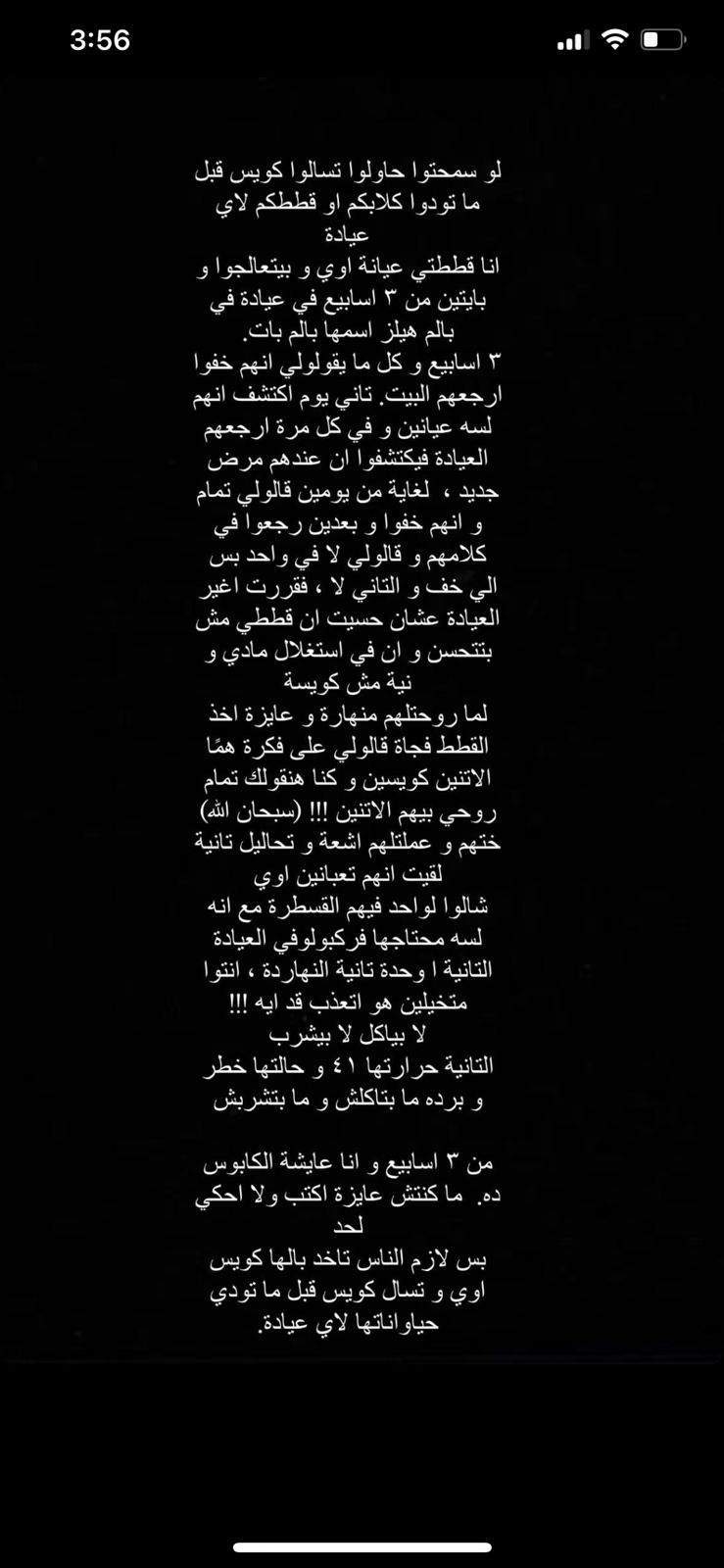 واختتمت عائشة حديثها: ختهم وعملت لهم أشعة وتحاليل تانية لقيت أنهم تعبانين أوي شالوا لواحد فيهم القسطرة مع أنه لسه محتاجها فركبوا له في العيادة الثانية، وحدة تانية النهاردة، انتوا متخيلين هو اتعذب قد ايه لا بياكل لا بيشرب، والتانية حرارتها 41 وحالتها خطر وبرده ما بتاکلش وما بتشربش من 3 أسابيع وأنا عايشة الكابوس ده ما كنتش عايزة اكتب ولا أحكي، لحد بس لازم الناس تاخد بالها كويس أوي وتسأل كويس قبل ما تودي حيواناتها لأي عيادة.