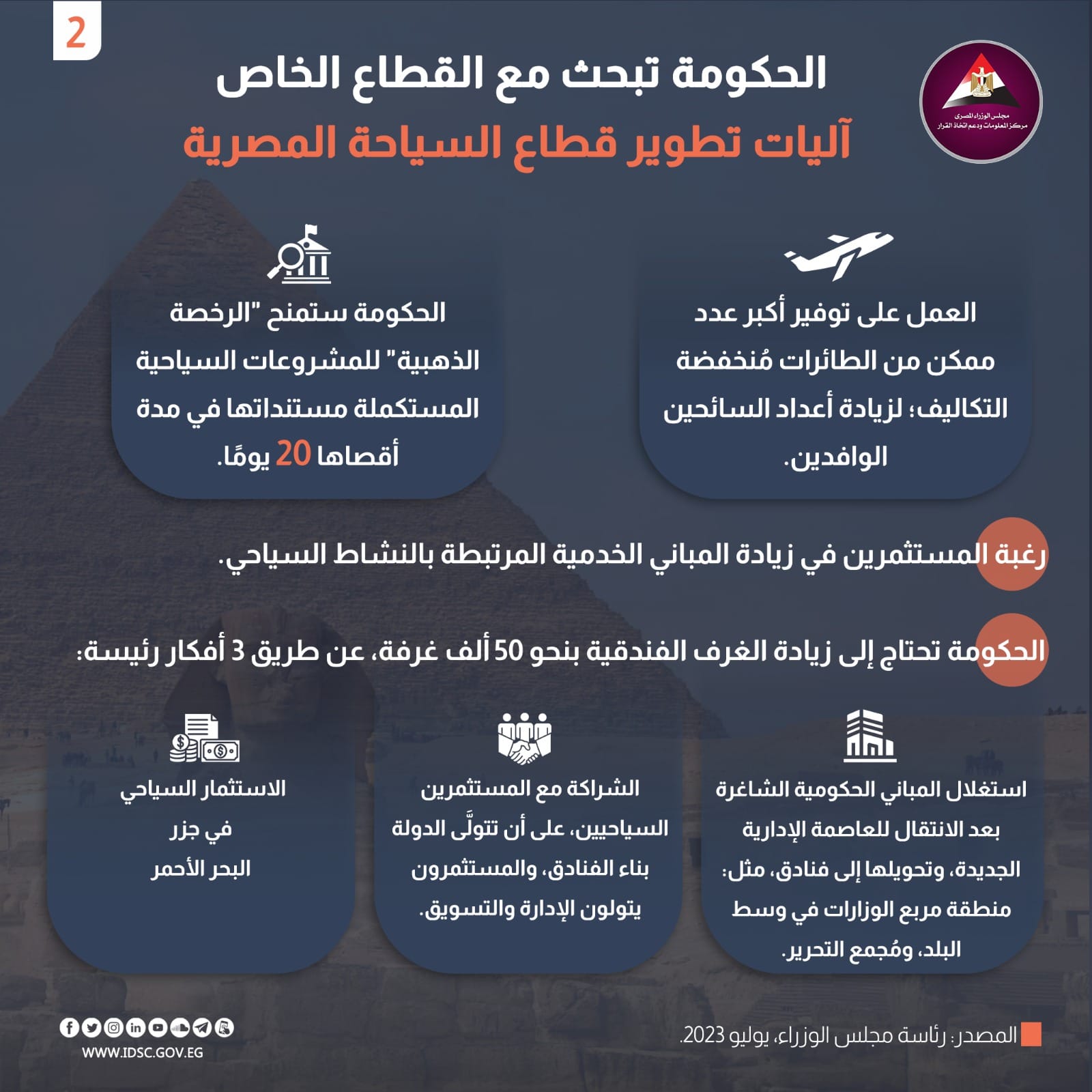 وخلال إنفوجراف، نشره معلومات الوزراء على صفحته الرسمية عبر فيسبوك، أفاد بأن الأفكار كالآتي: استغلال المباني الحكومية الشاغرة بعد الانتقال للعاصمة الإدارية الجديدة وتحويلها إلى فنادق مثل منطقة مربع الوزارات في وسط البلد، ومجمع التحرير، الشراكة مع المستثمرين السياحيين على أن تتولى الدولة بناء الفنادق والمستثمرون يتولون الإدارة والتسويق، الاستثمار السياحي في جزر البحر الأحمر.