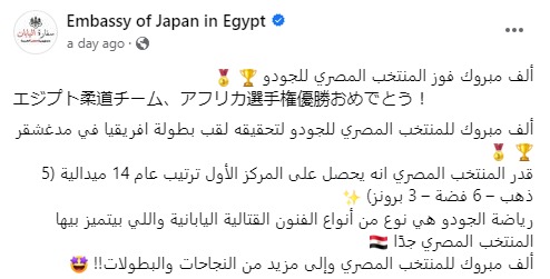 ووجهت السفارة اليابانية في القاهرة التهنئة لاتحاد الجودو بمناسبة فوز منتخب مصر بكأس البطولة الأفريقية للشباب والناشئين التي أقيمت مؤخرا في مدغشقر، وحصد 31 ميدالية متنوعة في منافسات الفردي والفرق.