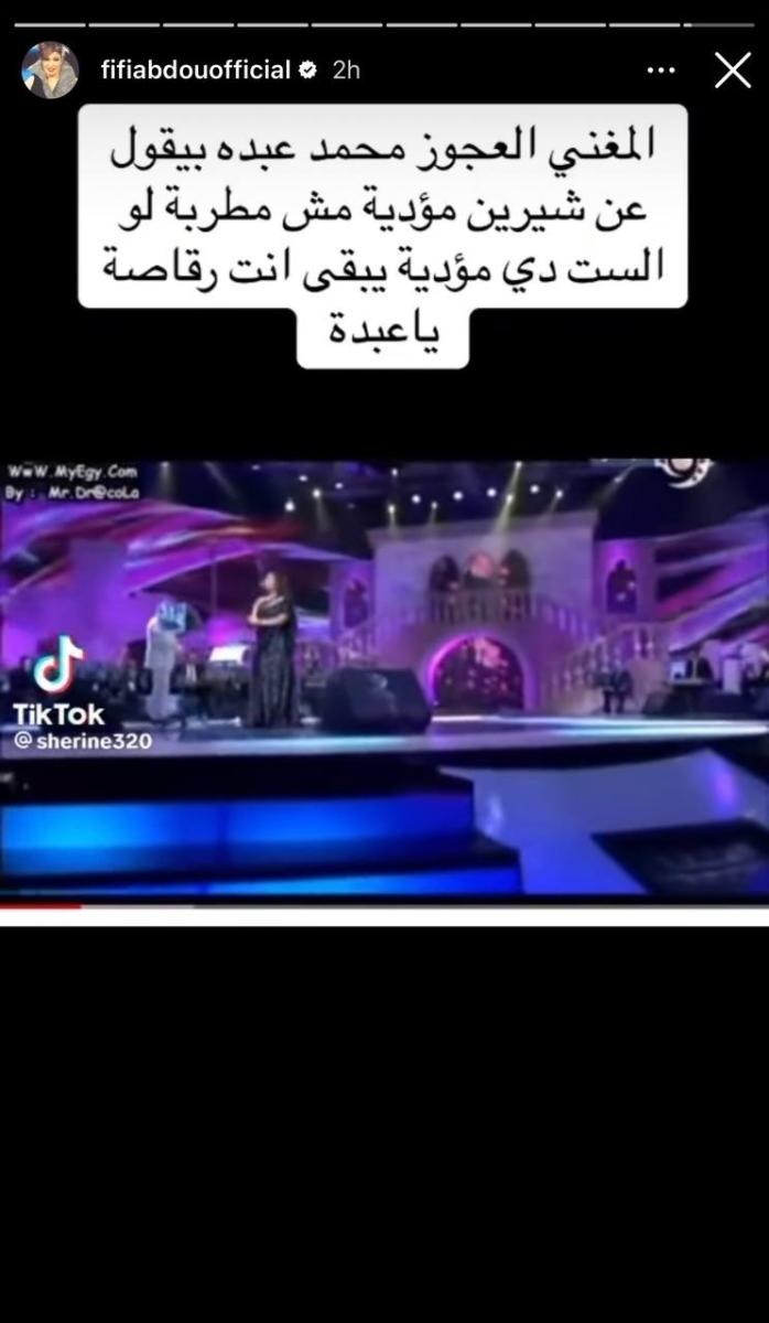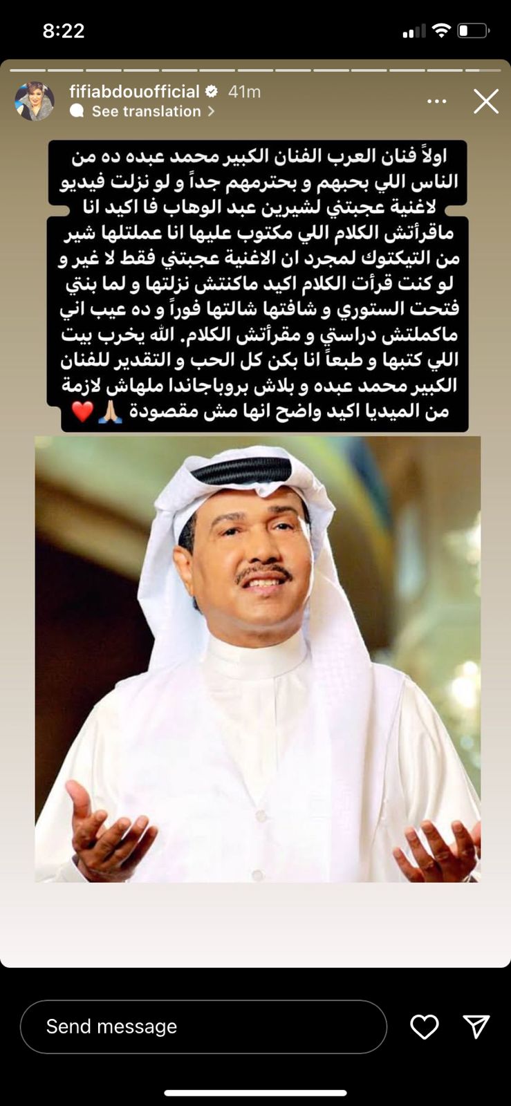 وكتبت فيفي عبده عبر حسابها بموقع انستجرام: أولا فنان العرب الكبير محمد عبده من الناس اللي بحبهم وبحترمهم جدا ولو نشرت فيديو لأغنية عاجبتني لـ شيرين عبد الوهاب فـ أكيد أنا مقرأتش الكلام المكتوب عليها وأنا عملت لها شير من التيك توك لمجرد أن الأغنية عجبتني فقط لا غير.