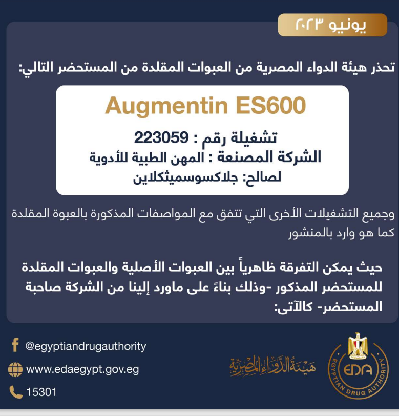 وأوضحت هيئة الدواء المصرية، في منشور لها، أن العبوات المقلدة من دواء اوجمنتين اي اس 600 تحمل تشغيلة رقم 223059، مشيرة إلى الفروقات الظاهرية بين العبوات المقلدة والأصلية، والتي تتمثل في النقط الثلاث في كلمة “الكلافيولانيك” مختلفة عن العلبة الأصلية.