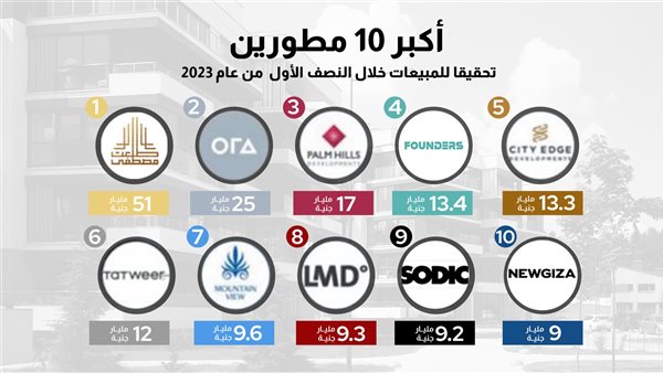 وحققت أكبر 10 شركات عقارية في مصر مبيعات بلغت 168 مليار جنيه خلال النصف الأول من عام 2023، بنسبة نمو 88% مقارنة بالفترة المماثلة من العام الماضي.