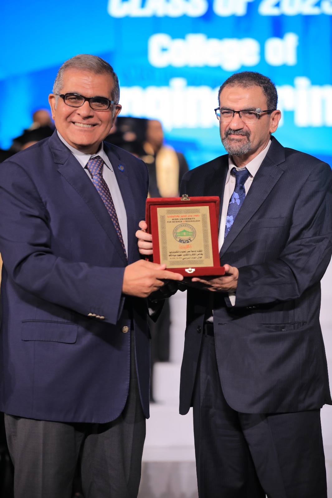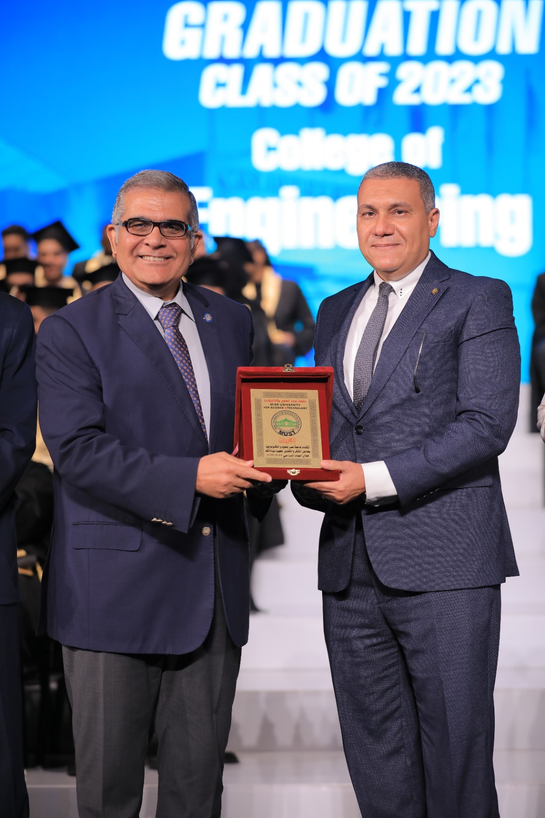 وقال الدكتور أشرف حيدر رئيس جامعة مصر للعلوم والتكنولوجيا: إننا نشهد هذه الأيام أجمل الاحتفالات بأبنائنا الطلاب، مضيفا: الحقيقة كل حاجة في الدنيا لها شكل هندسي وجميع العلوم لها أبعاد هندسية ومن هنا بدأ أخطر شيء حدث في العشر سنوات الأخيرة وهي الثورة الصناعية الرابعة، كما أن لهم الشرف أن تمتلك الجامعة خريجون من أعظم المهندسين ولديهم منطق في التفكير بين العلاقة الهندسية والعلوم المختلفة يستطيعون من خلالها أن يكونوا قادرين على أن يكونوا أصحاب ريادة أعمال لا ينتظرون المهنة بل هو من يبدعونها.