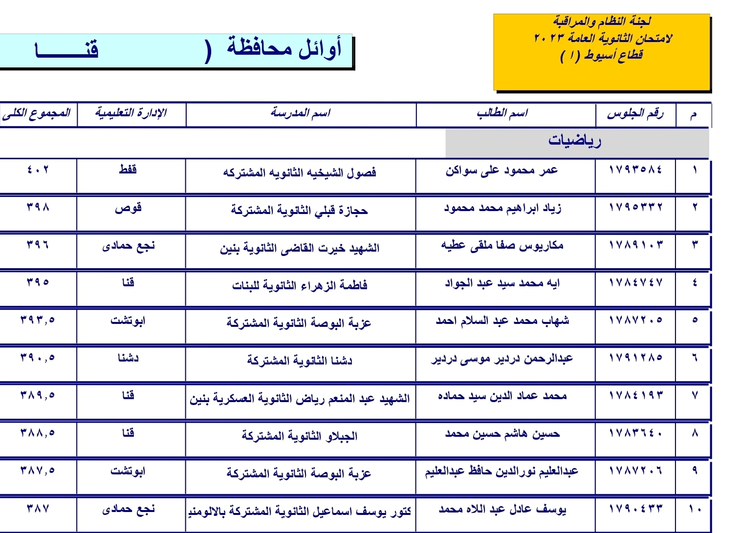 أعلن الدكتور محمد السيد وكيل وزارة التربية والتعليم بقنا، اليوم الأربعاء، أسماء الطلاب الأوائل بـ شهادة الثانوية العامة على مستوى المحافظة في الشعب الثلاث الأدبي وعلمي العلوم والرياضيات.