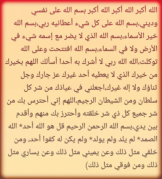 - اللهم إني أقدم بين يدي "واقرأ سورة الإخلاص 3 مرات"، وأقدم من خلفي "واقرأ سورة الإخلاص 3 مرات"، وأقدم عن يميني "واقرأ سورة الإخلاص 3 مرات" وأقدم عن شمالي "واقرأ سورة الإخلاص 3 مرات" وأقدم من فوقي "واقرأ سورة الإخلاص 3 مرات".