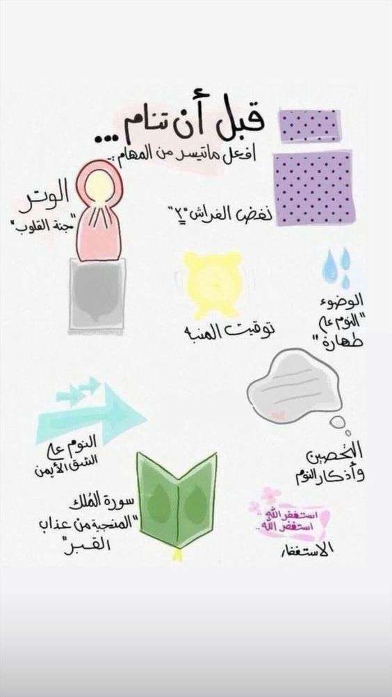 - حصنت نفسي بالحي القيوم الذي لا ينام، باسمك ربي وضعت جنبي وبك أرفعه، باسمك ربي أموت وأحيا.