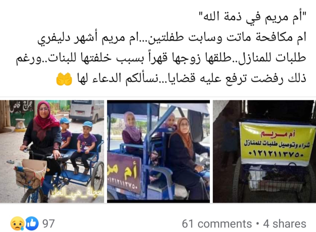 وقالت أم مريم، في حوارها السابق، أنها سبق عملت على توزيع بعض المنتجات للمحال التجارية مستخدمة دراجة هوائية في الانتقال بين المحال، ولكن مع مرور الوقت دبرت الأموال واشترت تروسيكل لمساعدتها في سرعة توزيع المنتجات، حيث كانت تسعى لتوفير دخلا جيدا للإنفاق على طفلتيها، مؤكدة أن أشقائها ووالدتها عرضوا عليه الإقامة معهم بمنزلهم لكنها رفضت وقامت باستئجار.