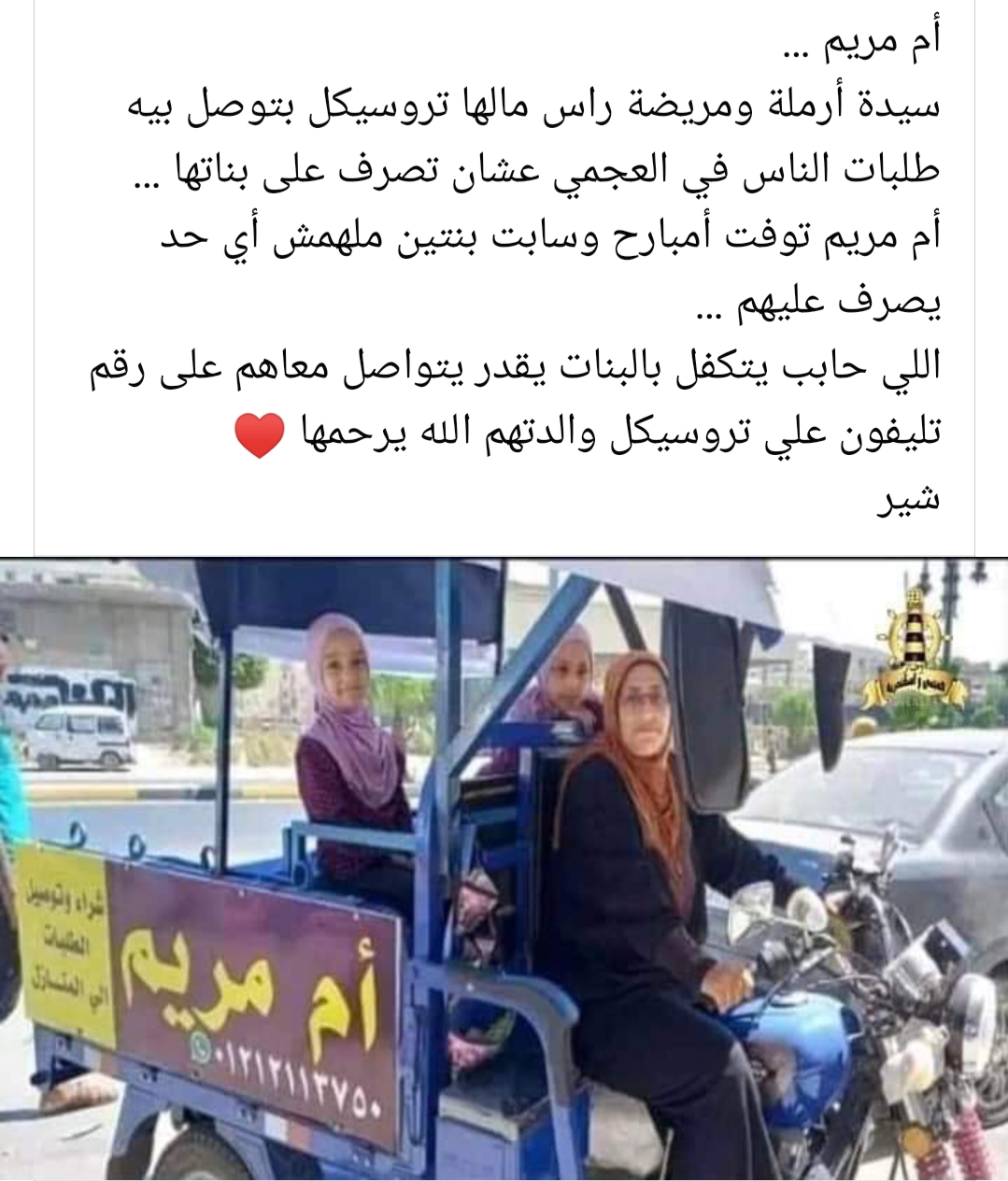 الأم المكافحة ماتت.. وفاة أم مريم سيدة التروسيكل الأشهر بالإسكندرية