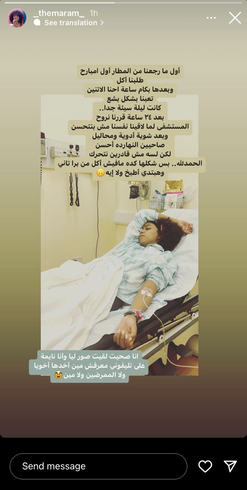 وتابعت مرام: بعد 24 ساعة قررنا نروح المستشفى، لما لاقينا نفسنا مش بنتحسن، وبعد شوية أدوية ومحاليل صاحيين النهارده أحسن، لكن لسة مش قادرين نتحرك الحمد لله.. بس شكلها كده مافيش أكل من برا تاني وهبتدي أطبخ ولا إيه.