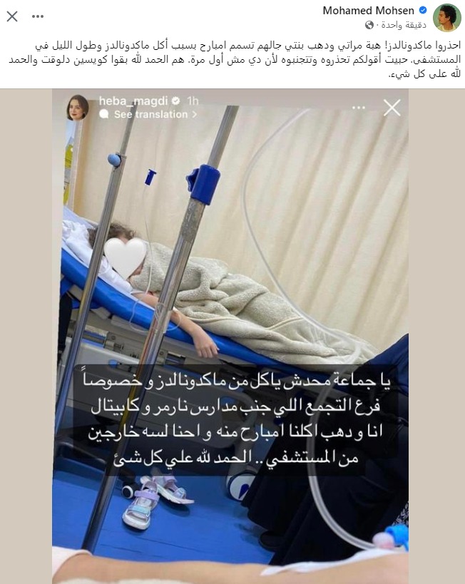 وكتب محمد محسن في منشور عبر حسابه بموقع التواصل الاجتماعي فيس بوك: احذروا ماكدونالدز! هبة مراتي ودهب بنتي جالهم تسمم امبارح بسبب أكل ماكدونالدز وطول الليل في المستشفى. حبيت أقولكم تحذروه وتتجنبوه لأن دي مش أول مرة. هم الحمد لله بقوا كويسين دلوقت والحمد لله على كل شيء.