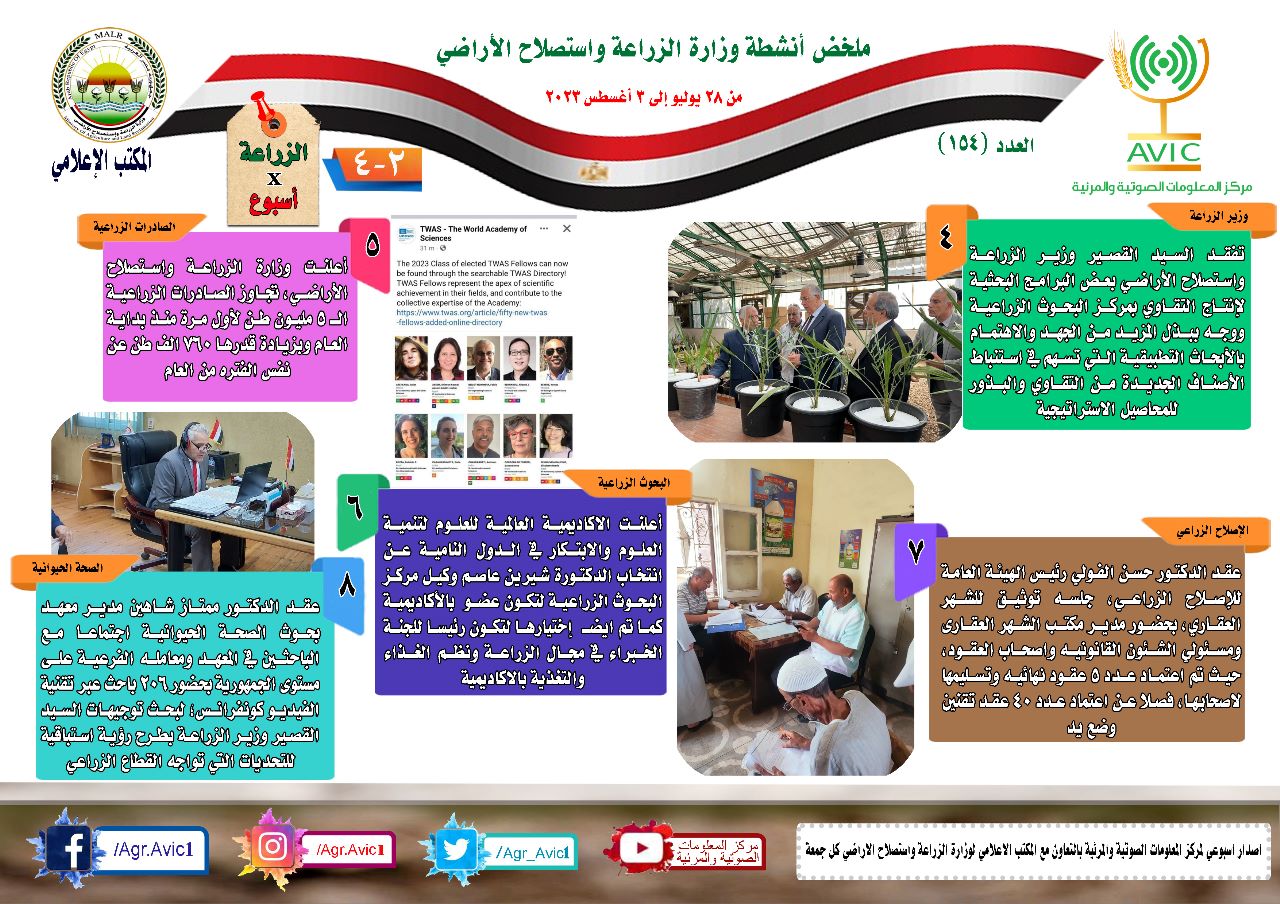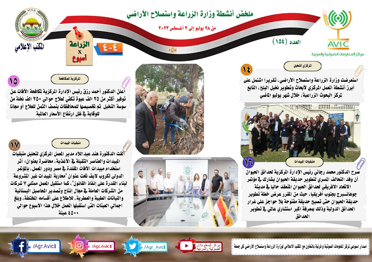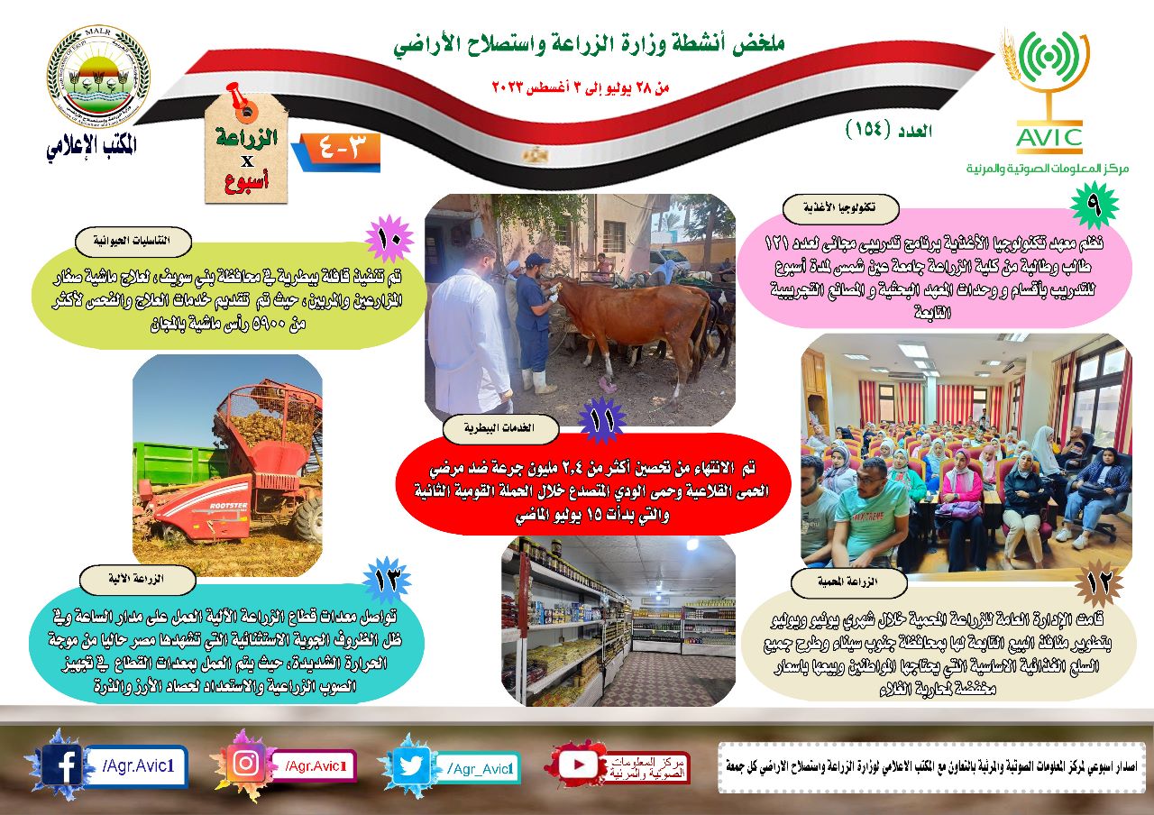 أصدر مركز المعلومات الصوتية والمرئية، التابع لوزارة الزراعة واستصلاح الأراضي، الانفوجراف الأسبوعي في نسخته رقم 154، حول الحصاد الأسبوعي لأهم أنشطة الوزارة، خلال الأسبوع الماضي في الفترة من 28 يوليو وحتى 3 أغسطس الجاري، وذلك بالتعاون مع المكتب الاعلامي للوزارة.