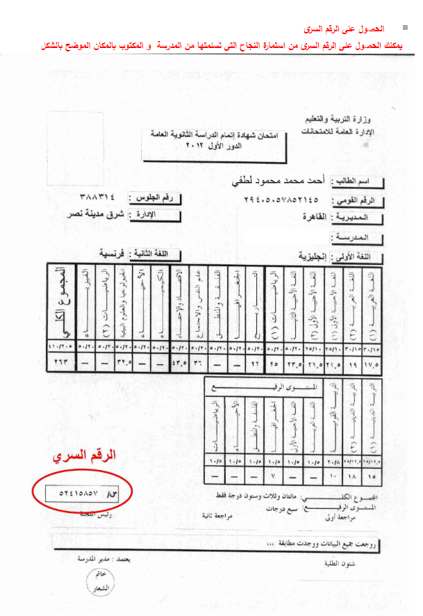 بعد استلام الطالب نتيجة الثانوية العامة 2023 سيجد الطالب الرقم السري على الجانب الأيسر من أسفل الشهادة كما موضح من خلال الصورة في الأعلى، ويتكون الرقم السري من 8 أرقام.