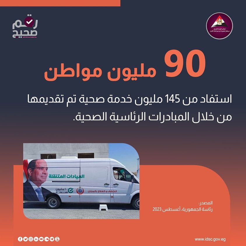 وأشار مركز المعلومات إلى أن 90 مليون مواطن استفاد من المبادرات الرئاسية، وذلك وفقًا لتوجيهات رئيس الجمهورية بأهمية صحة المواطن، وبالتعاون الكامل مع القطاع الخاص المحلي والأجنبي.