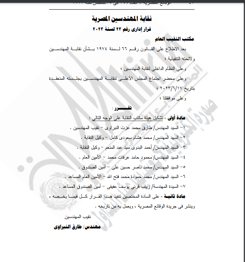 الجريدة الرسمية تنشر قرار نقيب المهندسين بإعادة تشكيل هيئة مكتب النقابة