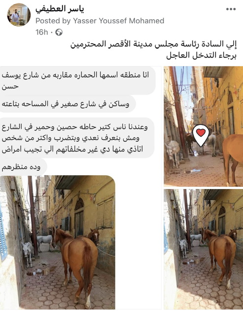 وقال بيان رئاسة مدينة الأقصر، إن الحملة استهدفت منطقة الحمارة بحي وسط بناء على شكوى وردت بصفحة ياسر العطيفي على فيس بوك بشأن تضرر الأهالي من وضع خيول وحمير بمنتصف شارع صغير بمنطقة الحمارة بالقرب من شارع يوسف حسن؛ ما يعيق حركة سير أهالي المنطقة ناهيك عن مخلفاتهم وانتشار الروائح الكريهة كما أنها تؤذي المواطنين أثناء عبور الطريق.