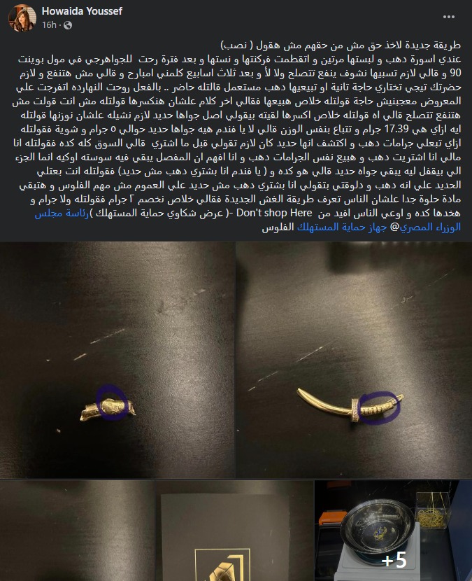 قالت الكاتبة الصحفية هويدا يوسف إنها تعرضت لحالة غش من أحد المحلات عندما اشترت أسورة ذهب بعدد جرامات معين، إلا أنها عند محاولتها بيع الأسورة لنفس المكان فوجئت بإخبارها بأنه سيعتبر 5 جرامات بالأسورة حديدا وليست ذهبا.
