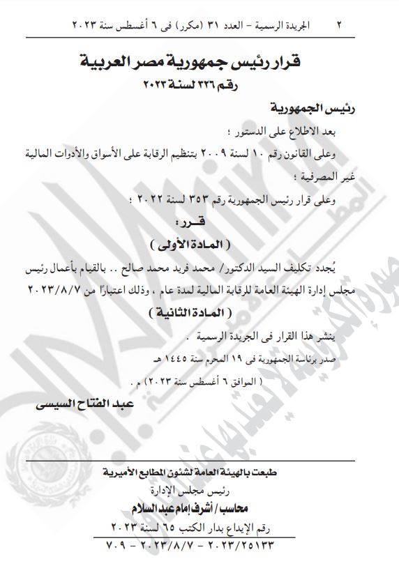 ونشرت الجريدة الرسمية، نص القرار الرئاسي رقم 326 لسنة 2023 بتجديد تكليف الدكتور محمد فريد صالح بالقيام بأعمال رئيس مجلس إدارة الهيئة العامة للرقابة المالية لمدة عام، وذلك اعتبارًا من 7 أغسطس 2023.