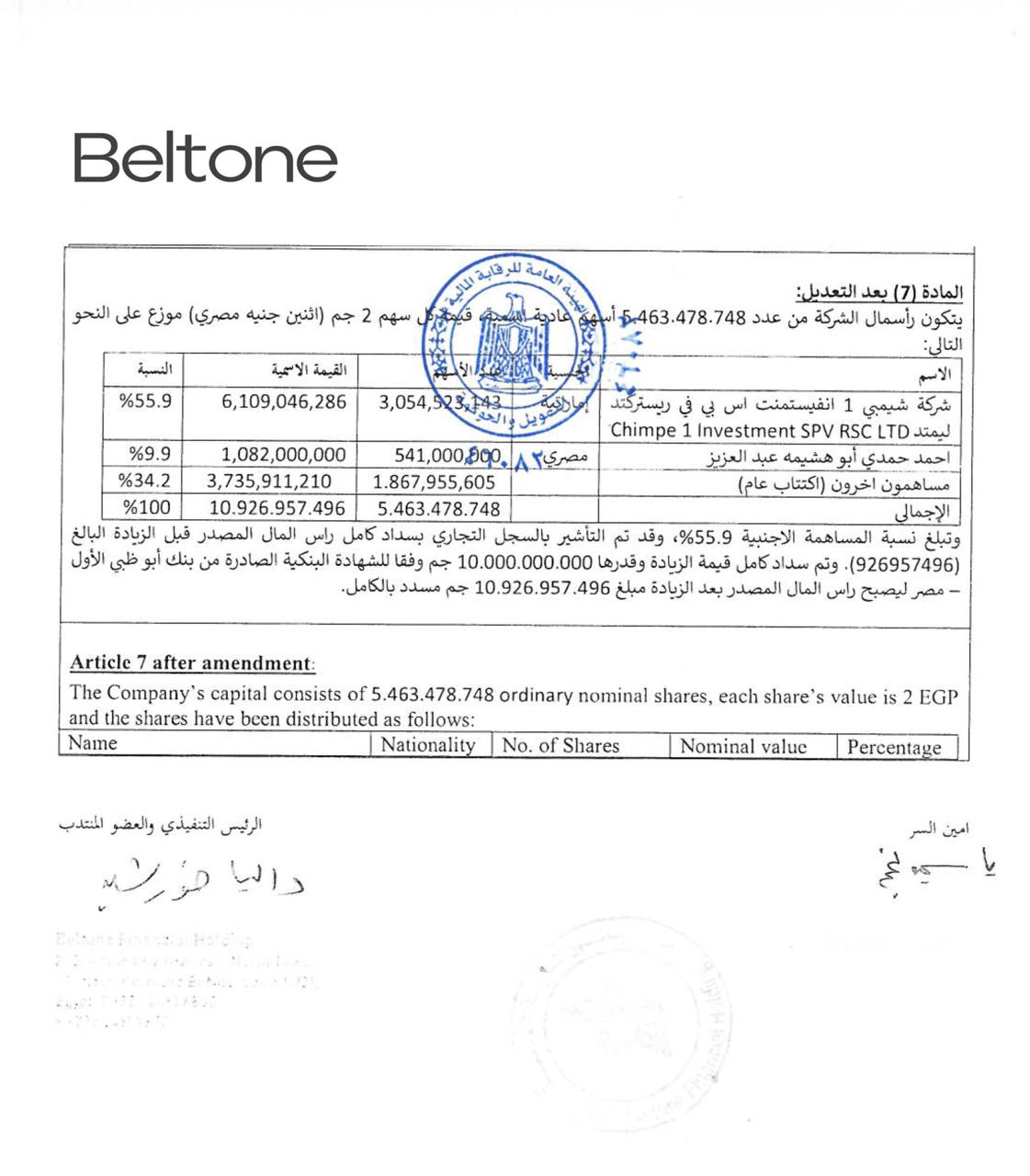 كما كشفت الشركة عن تعديل المادة السادسة من نظامها الأساسي لتصبح على النحو الآتي "حدد رأس مال الشركة المرخص به بمبلغ 11.000.000.000 (أحد عشر مليار جنيه مصري)، وحدد رأس مال الشركة المصدر بمبلغ 10.926.957.496 جنيه مصري موزعا على عدد 5.463.478.748 سهم، وقيمة كل سهم اثنين جنيه مصري وجميعها أسهم عادية اسمية.