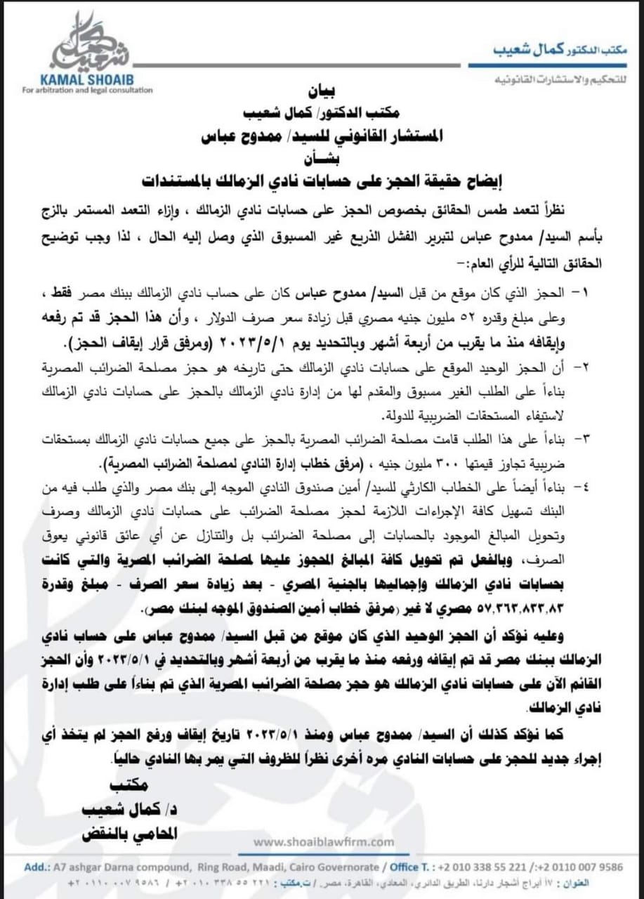 وعليه نؤكد أن الحجز الوحيد الذي كان موقع من قبل ممدوح عباس على حساب نادي الزمالك ببنك مصر قد تم إيقافه ورفعه منذ ما يقرب من أربعة أشهر وبالتحديد في 2023/5/1 وأن الحجز القائم الآن على حسابات نادي الزمالك هو حجز مصلحة الضرائب المصرية الذي تم بناء على طلب إدارة نادي الزمالك.