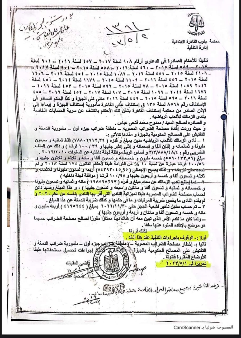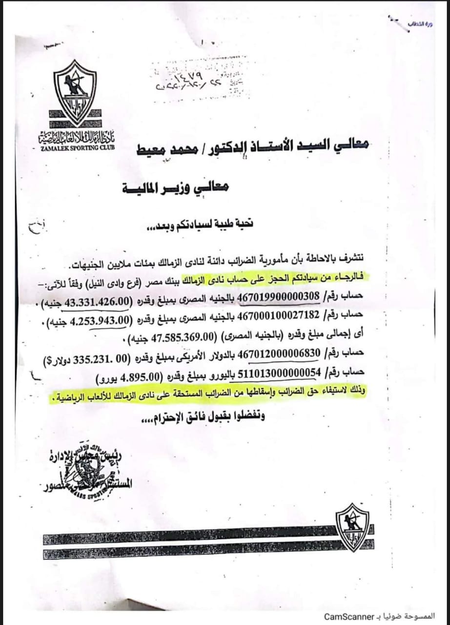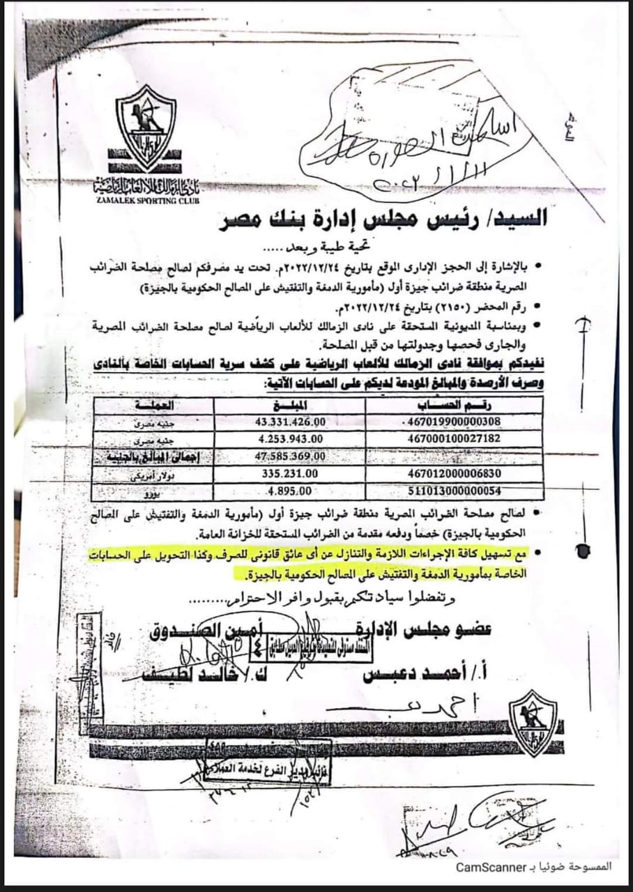 ٣- بناء على هذا الطلب حجزت مصلحة الضرائب المصرية على جميع حسابات نادي الزمالك بمستحقات ضريبية تجاوز قيمتها 300 مليون جنيه بناء أيضًا على الخطاب الكارثي لأمين صندوق النادي الموجه إلى بنك مصر والذي طلب فيه من البنك تسهيل جميع الإجراءات اللازمة لحجز مصلحة الضرائب على حسابات نادي الزمالك وصرف وتحويل المبالغ الموجود بالحسابات إلى مصلحة الضرائب بل والتنازل عن أي عائق قانوني يعوق الصرف.