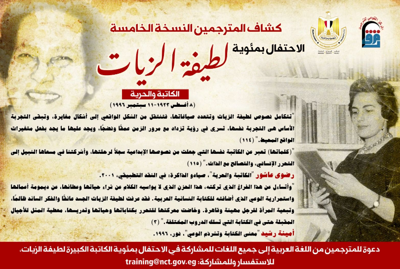 يحتفل المركز القومي للترجمة برئاسة الدكتورة كرمة سامي بمئوية الأديبة والكاتبة الكبيرة الدكتورة لطيفة الزيات، حيث يعلن المركز عن مسابقة لترجمة أحد مقالات الأديبة الراحلة وهو بعنوان الكاتب والحرية، من كتاب الأدب والوطن.
