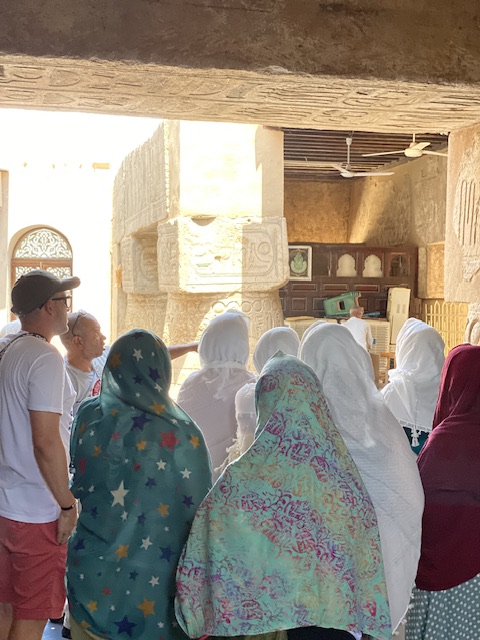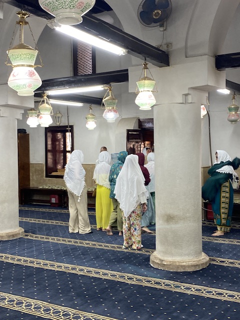 وحرصت السائحات في المجموعة على ارتداء الحجاب بتغطية رؤوسهن بشالات وإيشارابات قماشية تنوعت مابين الأبيض والألوان احتراما وإجلالا لقدسية المكان، حيث تجول السائحون بالمسجد وردهاته وصحن المسجد مستمعين ومنصتين باهتمام لشرح المرشد السياحي معهم.