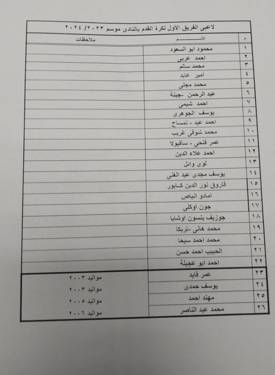 محمود أبو السعود وأحمد عربي ومحمد سالم وأمير عابد ومحمد مجلي وعبد الرحمن خالد جبنة وأحمد شيمي ويوسف الجوهري وأحمد عيد تمساح ومحمد شوقي غريب وعمر فتحي سافيولا وأحمد علاء الدين ولؤي وائل ويوسف مجدي وفاروق نور الدين وأمادو نياص وجوزيف أوشايا وجون أوكلي ومحمد هاني تريكا ومحمد سيحا والحبيب أحمد حسن وأحمد أبو عجيلة، بالإضافة إلى تصعيد رباعي تحت السن عمر فايد ويوسف حمدي مواليد 2003 ومهند أحمد مواليد 2005 ومحمد عبد الناصر مواليد 2006.