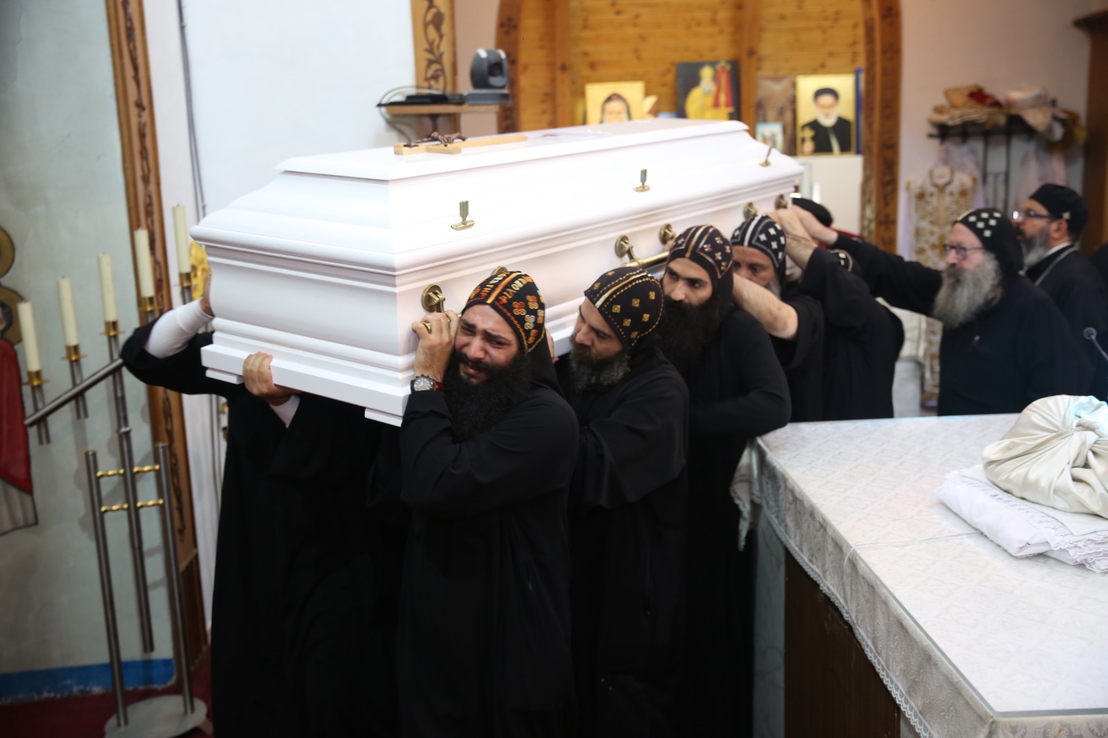 وأقيم القداس الإلهي في التاسعة من صباح اليوم، بحضور جثمان الأب الأسقف الجليل المتنيح، قبل أن تبدأ صلوات الجنازة، التي شارك فيها إلى جانب صاحبي النيافة الأنبا برنابا والأنبا أرساني، أصحاب النيافة الأنبا دميان أسقف ورئيس دير السيدة العذراء والشهيد أبي سيفين بهوسكتر وشمالي ألمانيا، والأنبا جابريل أسقف النمسا، والأنبا ثيؤدوسيوس أسقف وسط الجيزة، والإنبا مارك أسقف باريس وشمالي فرنسا، والأنبا أنطونيو أسقف ميلانو، ونيافة المطران مار فليكسينوس ماتياس نايش مطران الكنيسة السريانية الأرثوذكسية في ألمانيا، وكهنة من الكنيستين الإثيوبية والإريترية، ومجمع رهبان الدير ومجمع كهنة إيبارشية جنوبي ألمانيا وأعداد كبيرة من الشعب القبطي.