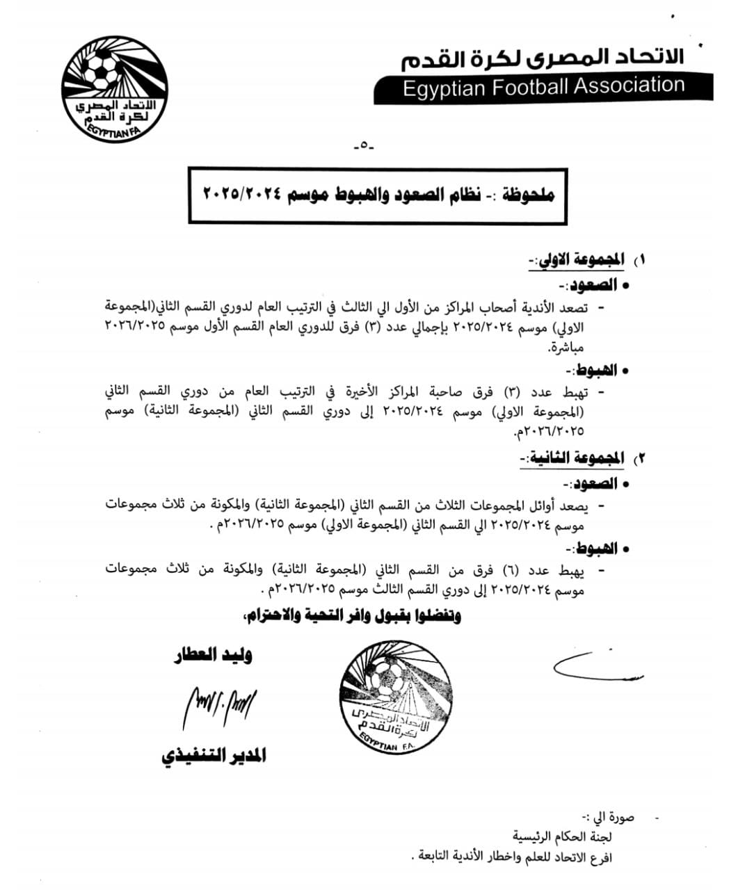 وأرسل الاتحاد المصري لكرة القدم اليوم للأندية نظام الصعود والهبوط الخاص بالموسم الجديد 2024-2025.