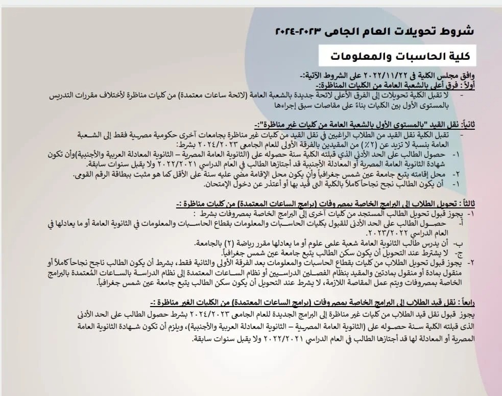 شروط التحويلات لكلية الحاسبات والمعلومات لعام 2023-2024
