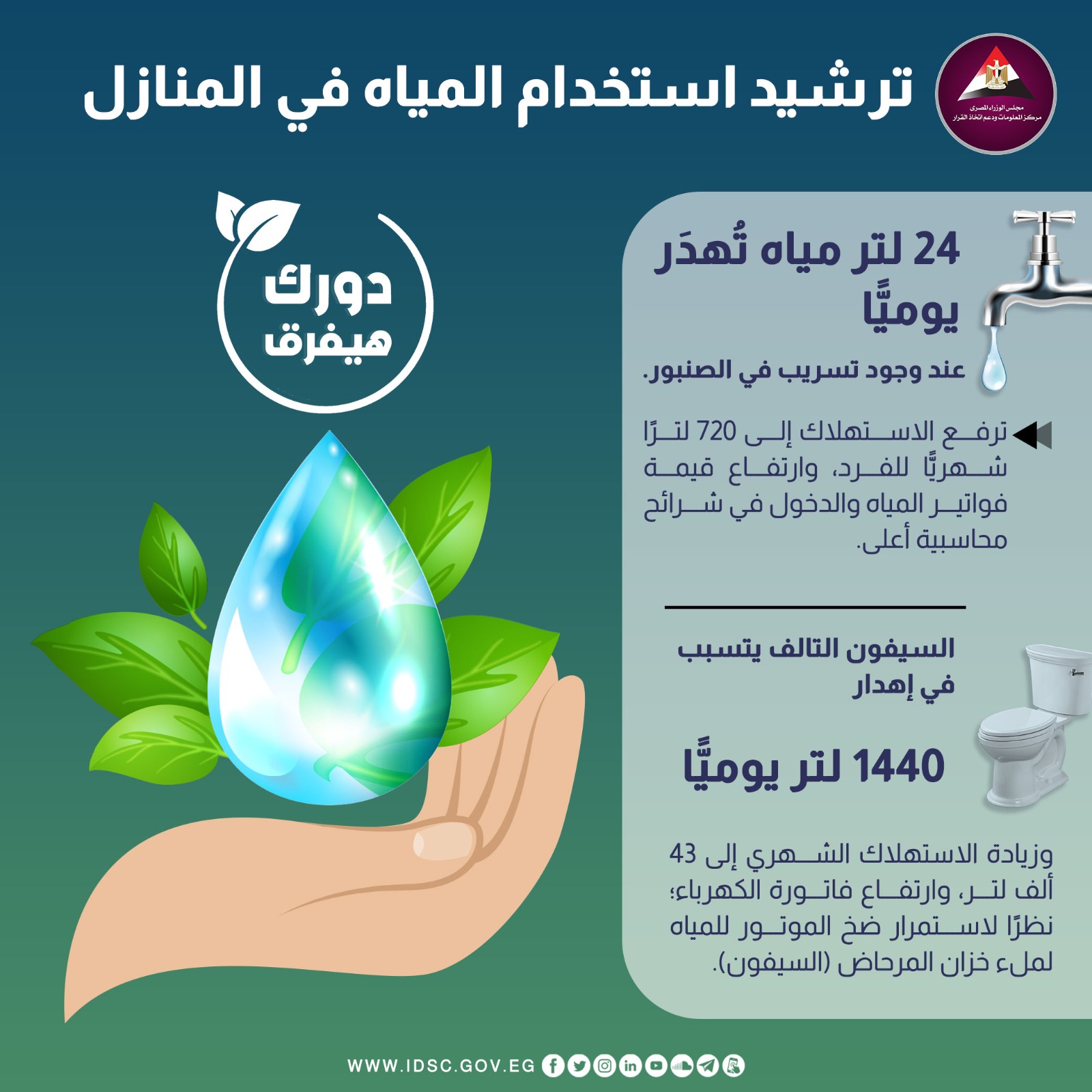 وأضاف معلومات الوزراء، خلال منشور له عبر صفحته الرسمية على فيسبوك: من المهم والضروري ترشيد استهلاك المياه في المجالات كلها، وهناك الكثير نستطيع فعله في منازلنا من أجل الحفاظ على هذا المورد المهم، خاصة وأن شُحّ المياه العذبة أصبح قضية تؤرِّق العالم كله.