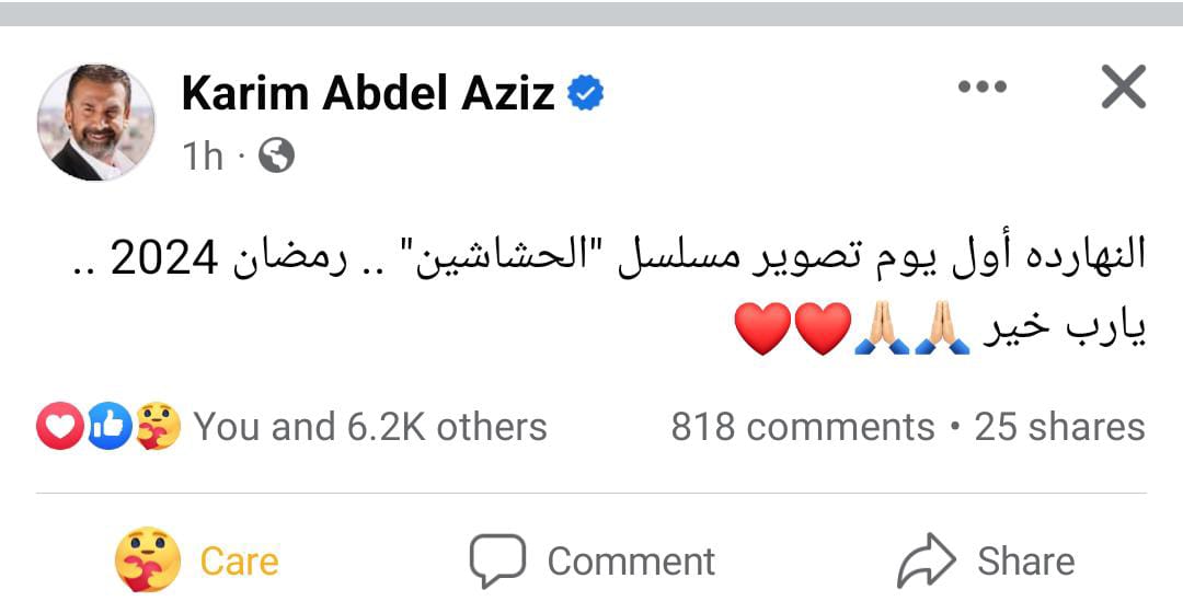 وكتب كريم عبد العزيز منشورا عبر حسابه الشخصي بموقع فيسبوك، جاء فيه: النهارده أول يوم تصوير مسلسل الحشاشين، رمضان 2024 يارب خير.