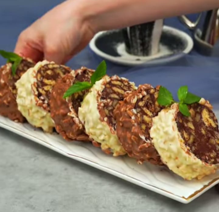 - في طبق عميق قومي بتكسير البسكويت بشكل عشوائي ثم ضيفي إليه المكسرات المجروشة وقلبيهما جيدًا.