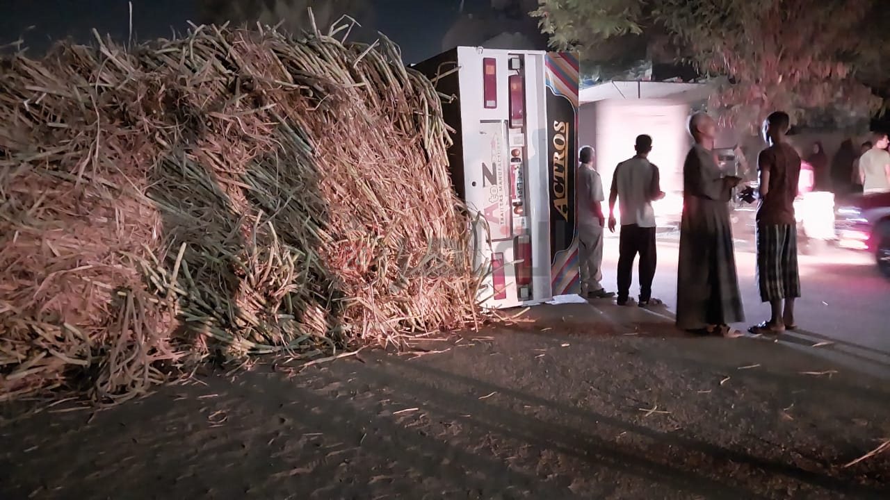 انقلاب تريلا محملة بالقصب على الطريق الزراعي