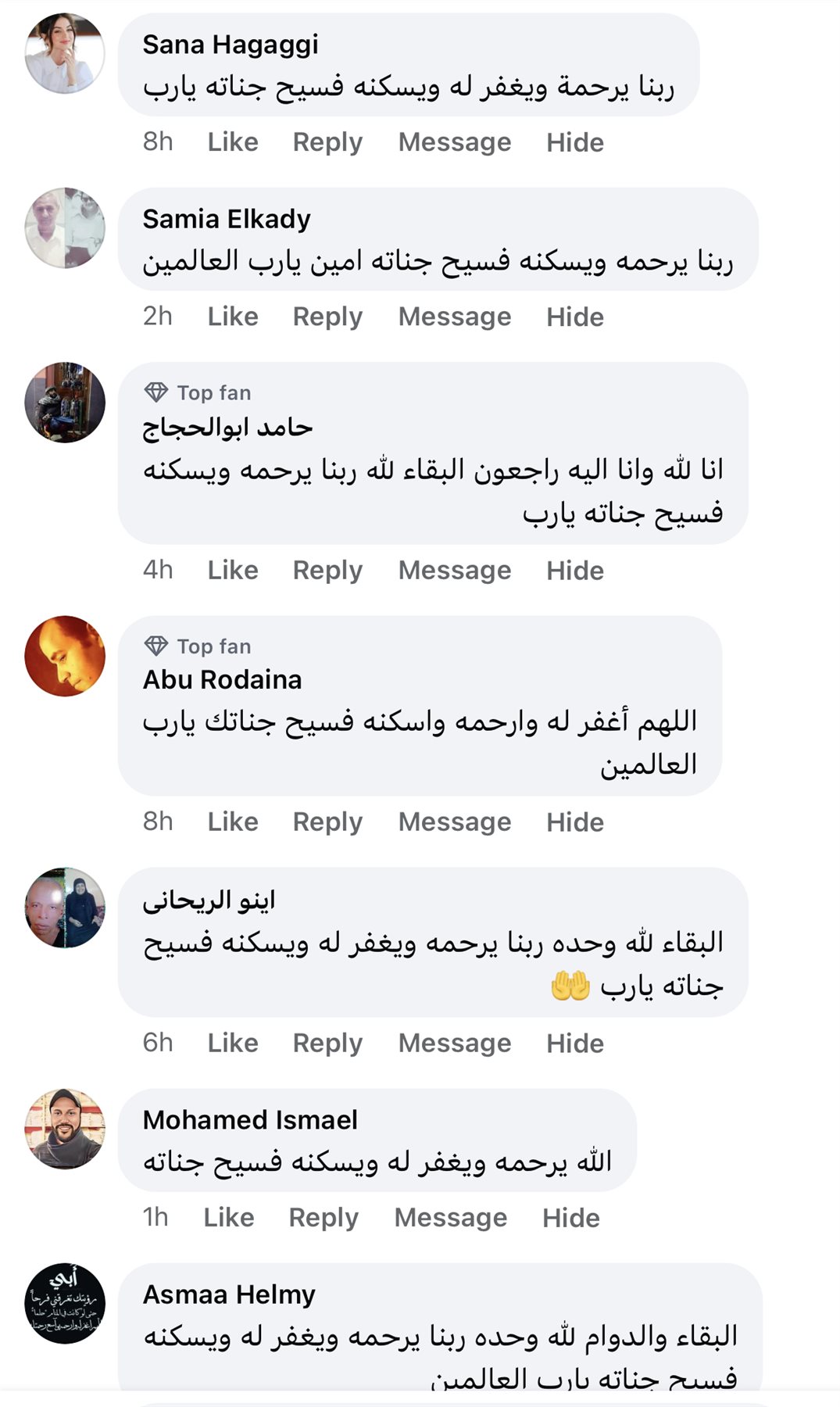 وانهالت التعليقات الحزينة فور سماع خبر وفاة العم مصطفى، الذي وافته المنية عقب صلاة الجمعة، داعين الله عز وجل أن يتغمده بواسع رحماته وأن يغفر له ويسكنه جنات النعيم.