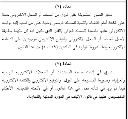 وجاء بالمادة (7) أنه تسري في إثبات صحة المستندات أو السجلات الالكترونية الرسمية، والعرفية وصورها المنسوخة على الورق، والتوقيع الالكتروني والكتابة الإلكترونية، فيما لم يرد في شأنه نص في هذا القانون أو في لائحته التنفيذية، الأحكام المنصوص عليها في قانون الإثبات في الموارد المدنية والتجارية.