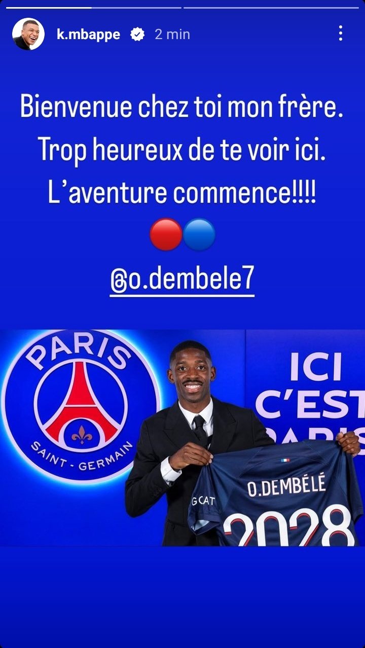 ونشر مبابي صورة لـ ديمبلي معلقا: مرحبًا بك في بيتك أخي، سعيد جدًا لرؤيتك هنا.. المغامرة تبدأ الآن.