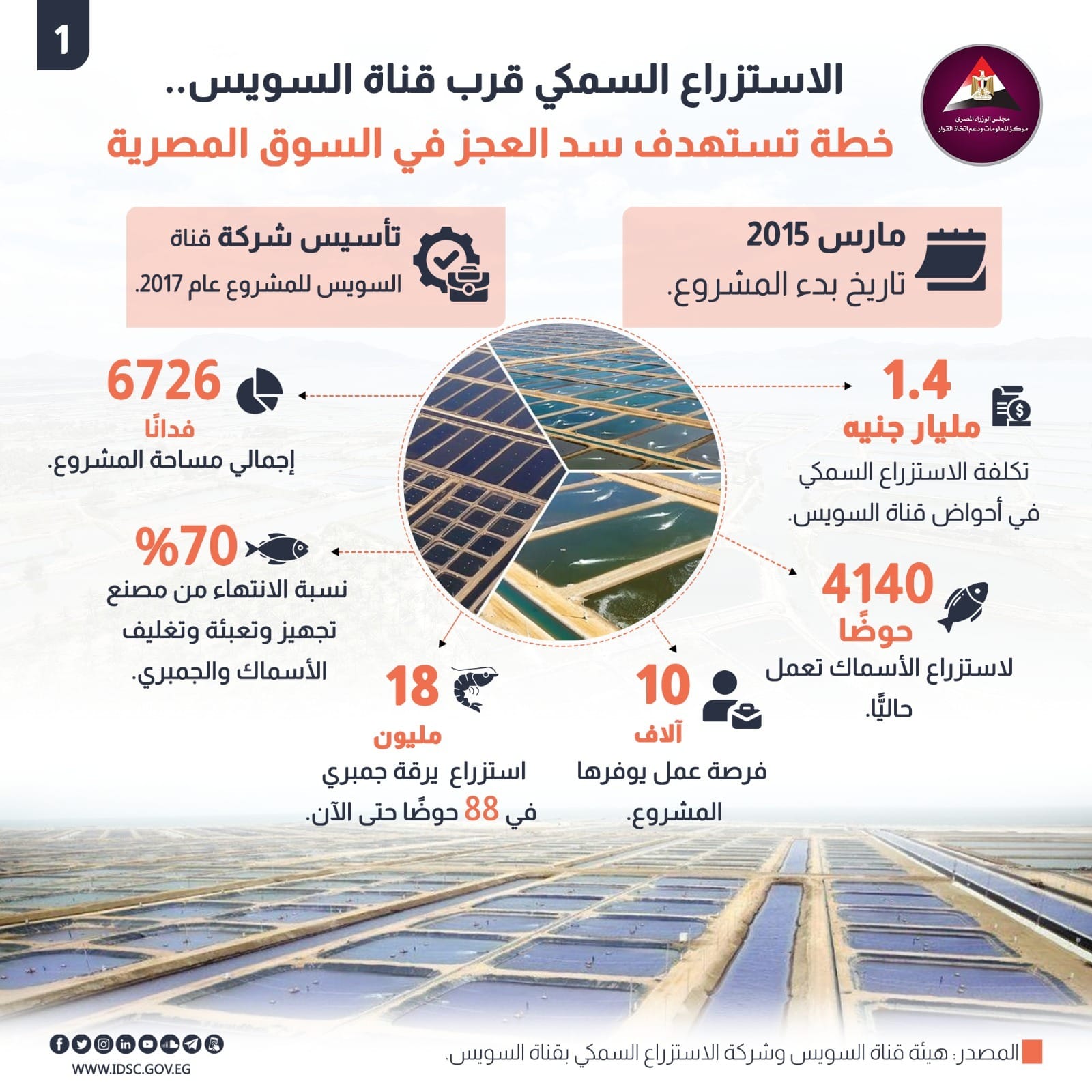سلط مركز المعلومات ودعم اتخاذ القرار في مجلس الوزراء، الضوء على خطة الاستزراع السمكي قرب قناة السويس لسد العجز في الأسواق المصرية.