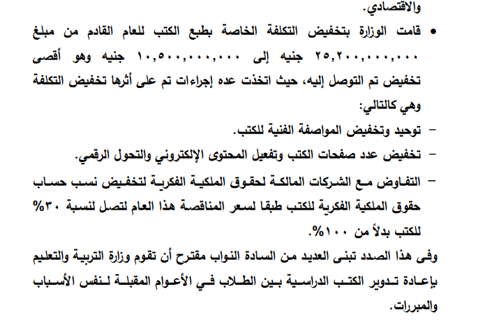 وفي هذا الصدد، كشف اللجنة أن العديد من النواب تبنوا مقترح أن تقوم وزارة التربية والتعليم بإعادة تدوير الكتب الدراسية بين الطلاب في الأعوام المقبلة لنفس الأسباب والمبررات التي اتخذت بها الوزارة عدة إجراءات، تم على أثرها تخفيض التكلفة، وشملت الإجراءات الآتي:-