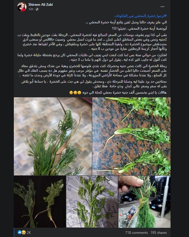 ونشر حساب باسم سهر علي: مفيش خالص الفترة اللي عدت بتاعة الحر حرقت الخضار في الأرض، وأقسم بالله كنت بلف على الراجل اللي بنشتري منه أكننا بندور على مخدرات بس احنا بنبيعها 3 بـ 10 بس بتخلص على طول، عايزة أعمل محشي ومش لاقية خضرة ابدا هو المحشي ينفع من غير خضرة.