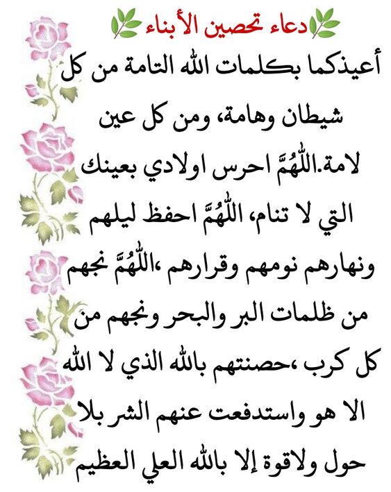 - اللهم حصنت أولادي باسمك العظيم من كل شيطان رجيم ومن كل إنس وجان وباغ وحاسد ومن شر كل شيء انت آخذ بناصيته.