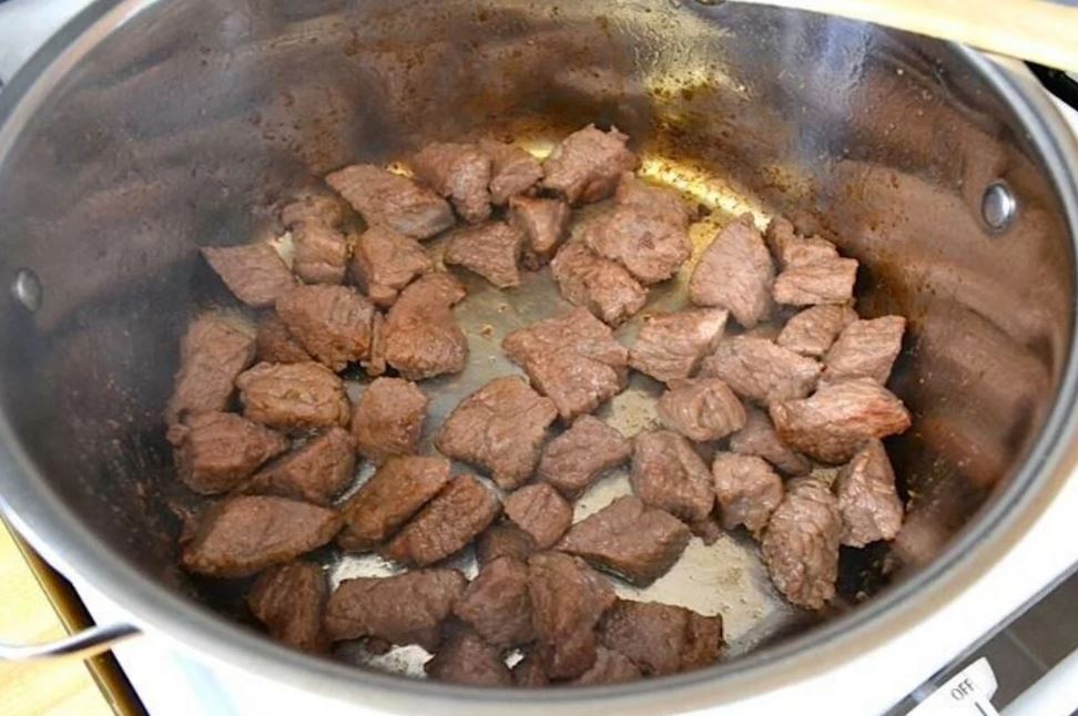 - بينما الخطوة الرابعة يضاف إليها اللحم مع التقليب المستمر حتى يتغير لونها، ويضاف إليها مكعبات البطاطس.