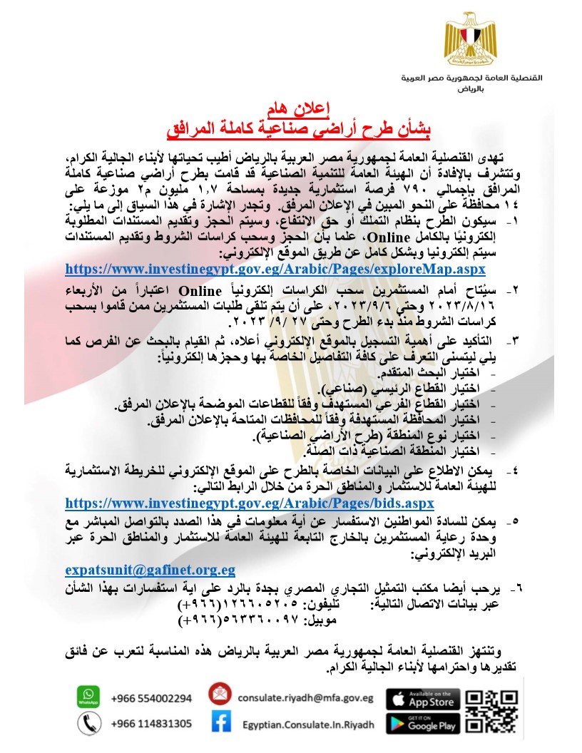 790 فرصة استثمارية.. قنصلية الرياض تعلن طرح أراضٍ صناعية كاملة المرافق للمصريين بالخارج والعرب