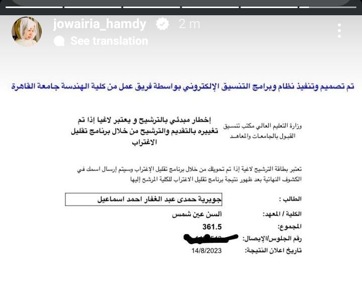 ونشرت جورية، صورة من استمارة الرغبات الخاصة بها والتي تشير أنها التحقت بكلية السن عين شمس، وذلك عبر خاصية ستوري على حسابها الشخصي بموقع انستجرام.