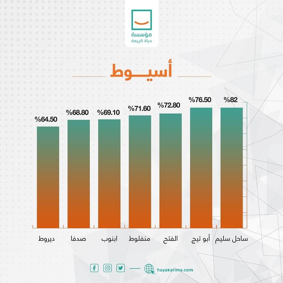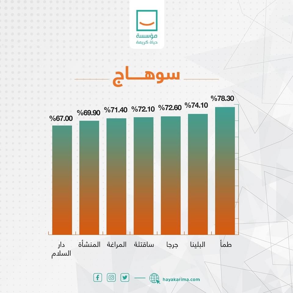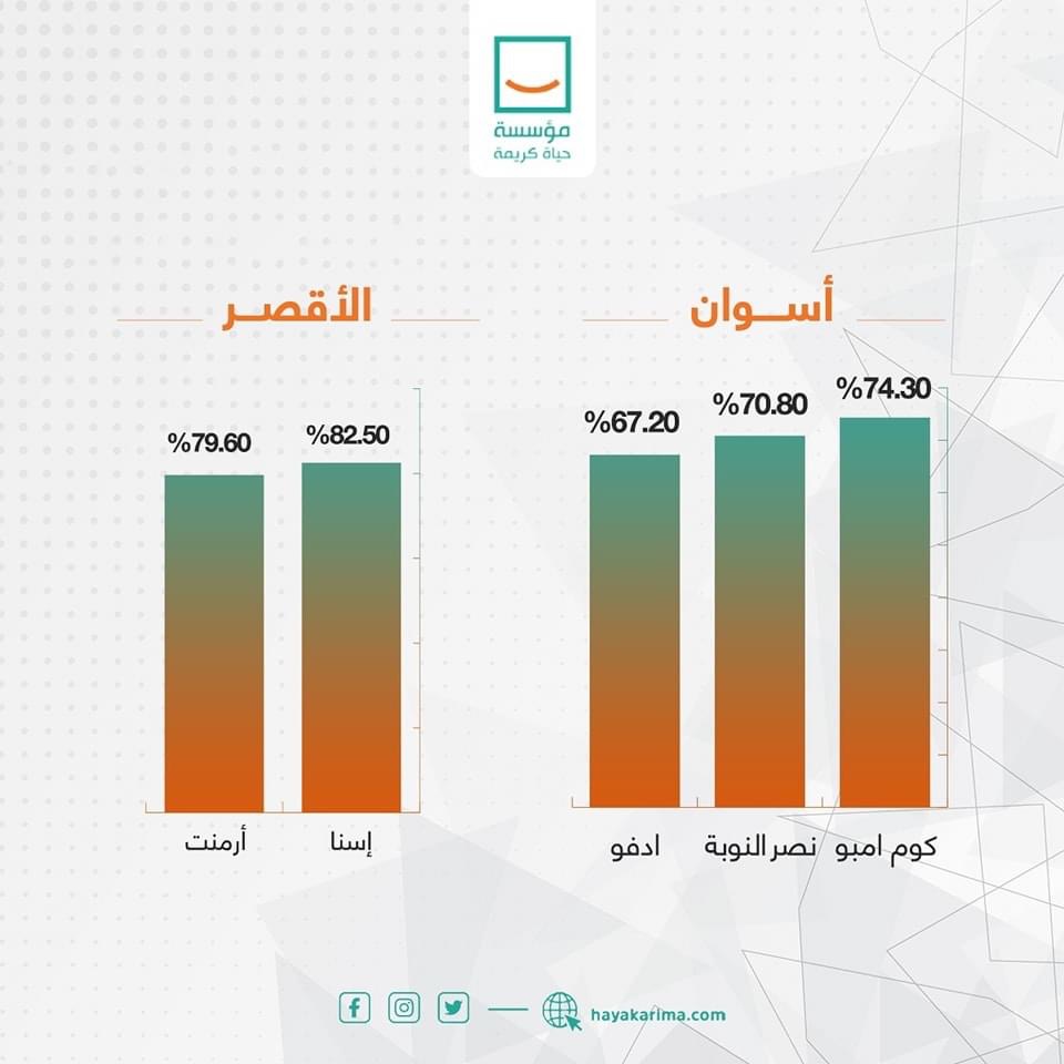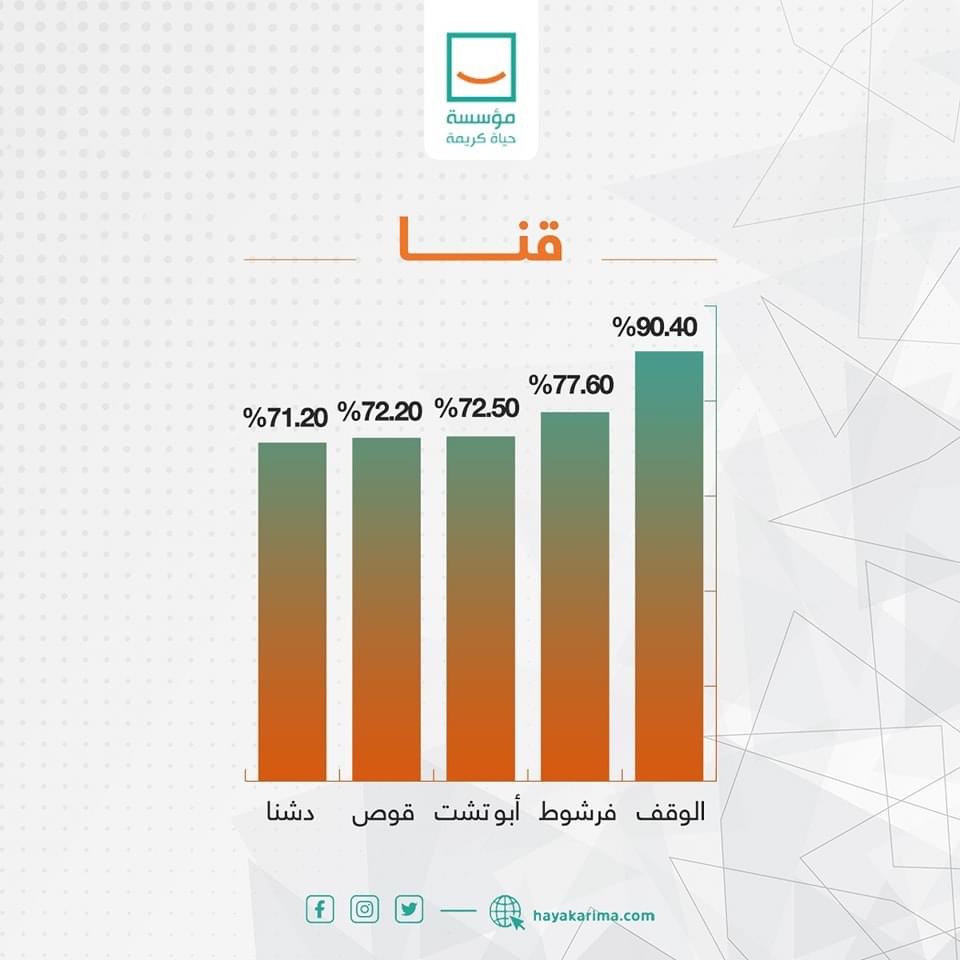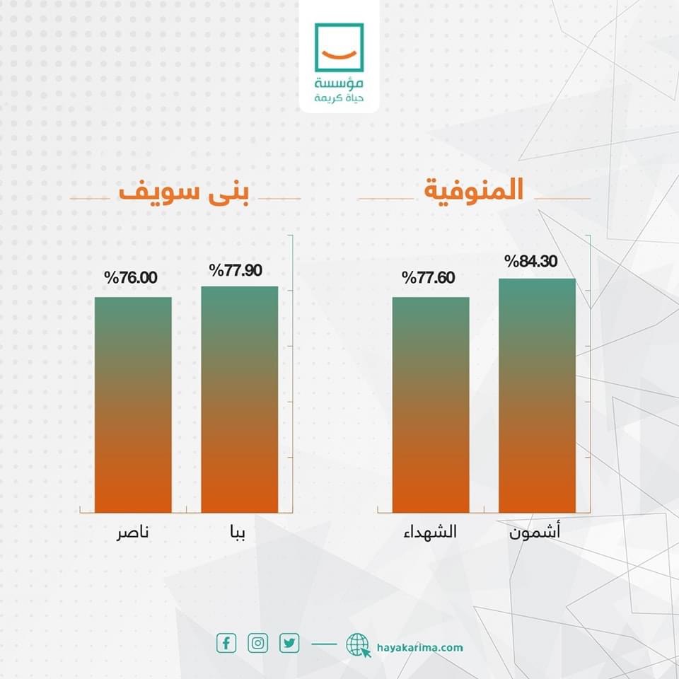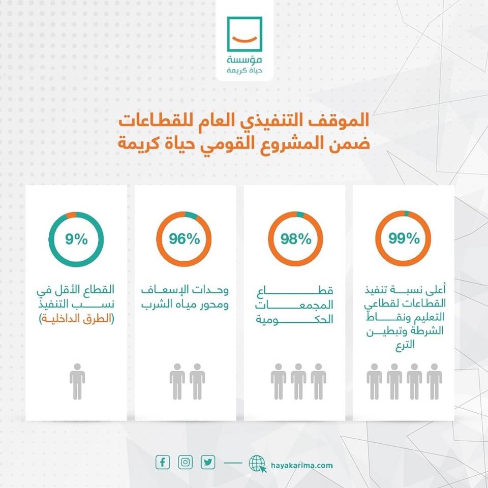 واستعرضت حياة كريمة، عبر صفحتها الرسمية بموقع التواصل الاجتماعي فيس بوك، حجم الإنجازات في محافظات المرحلة الأولى بالأرقام، وكذلك الموقف التنفيذي العام للقطاعات ضمن المشروع القومي حياة كريمة، حيث استحوذت قطاعات التعليم ونقاط الشرطة وتبطين الترع على أعلى نسبة تنفيذ للقطاعات بنسبة تصل إلى 90 ٪، و98 % قطاع المجمعات الحكومية، و96 % وحدات الإسعاف ومحور مياة الشرب، بجانب 9 ٪ لقطاع الطرق الداخلية وهو القطاع الأقل نسبة في التنفيذ.