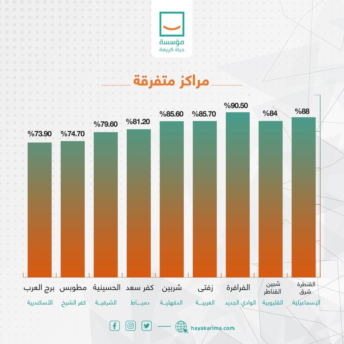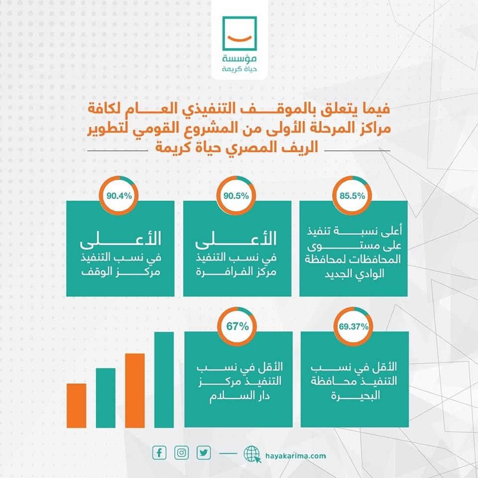 وأشارت حياة كريمة، إلى الموقف التنفيذي العام لكافة مراكز المرحلة الأولى من المشروع القومي لتطوير الريف المصري حياة كريمة، موضحة أن محافظة الوادي الجديد أعلى نسبة تنفيذ على مستوی المحافظات بنسبة 85.5 %، والأعلى في نسب التنفيذ مركز الفرافرة بنسبة 90.5 %، ونحو 90.4 ٪ الأعلى في نسب التنفيذ مرکز الوقف، و69.37 ٪ الأقل في نسب التنفيذ من نصيب محافظة البحيرة، و67 ٪ الأقل في نسب التنفيذ مركز دار السلام.