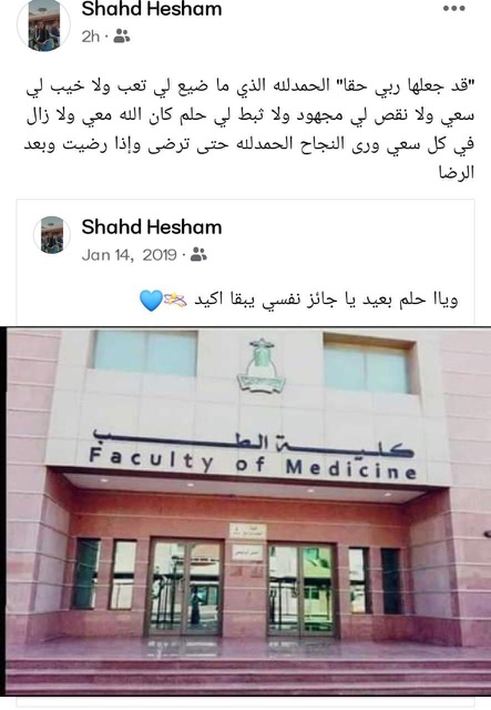 وكتبت الطالبة شهد هشام على صفحتها بالفيسبوك ناشرة صورة لكلية الطب: قد جعلها ربي حقا، الحمد لله الذي ما ضيع لي تعب، ولا خيب لي سعي، ولا نقص لي مجهود.