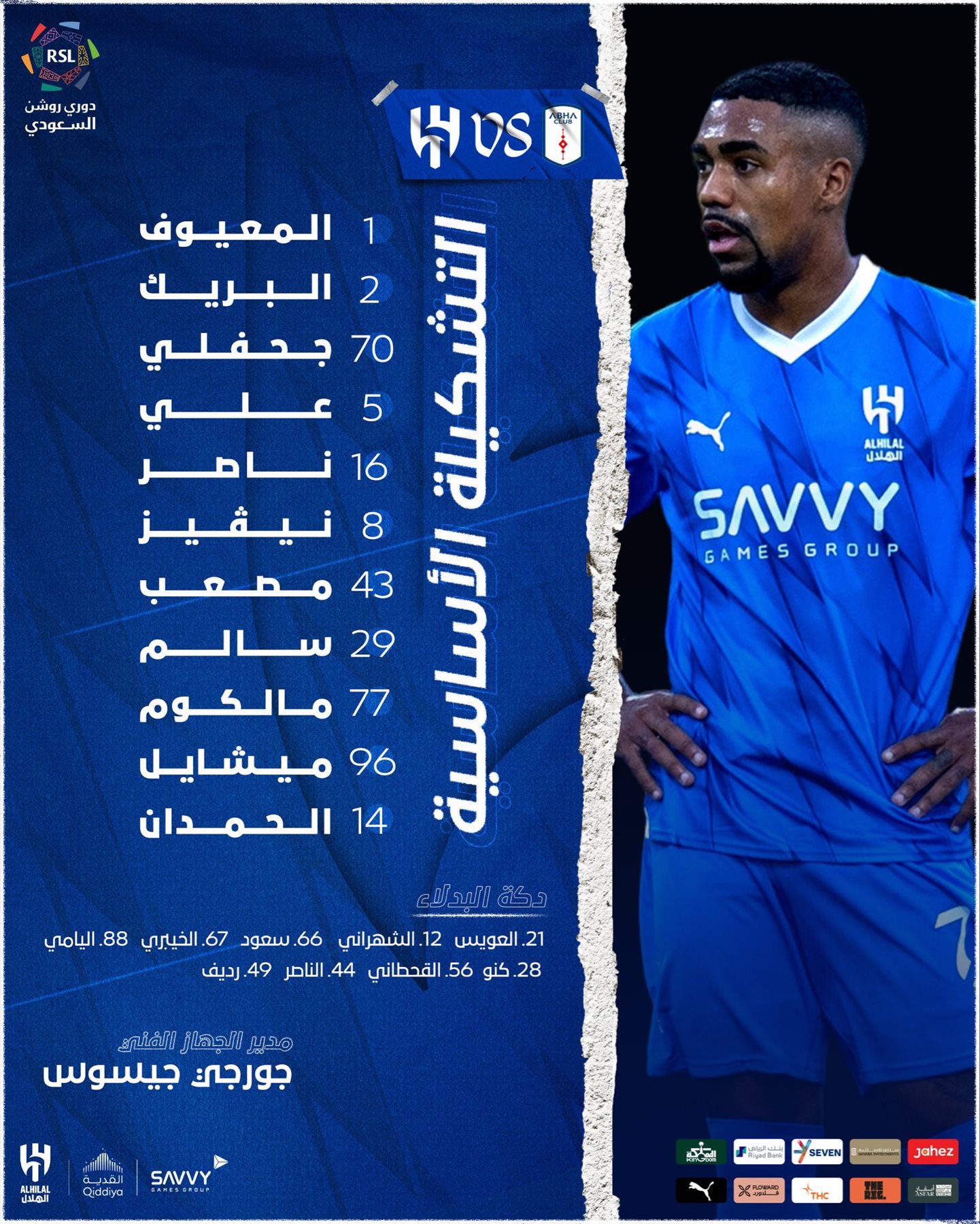 ويأتي تشكيل الهلال الذي أعلن عنه خيسوس لمواجهة أبها بعد قليل في الدوري السعودي للمحترفين، على النحو الآتي:-