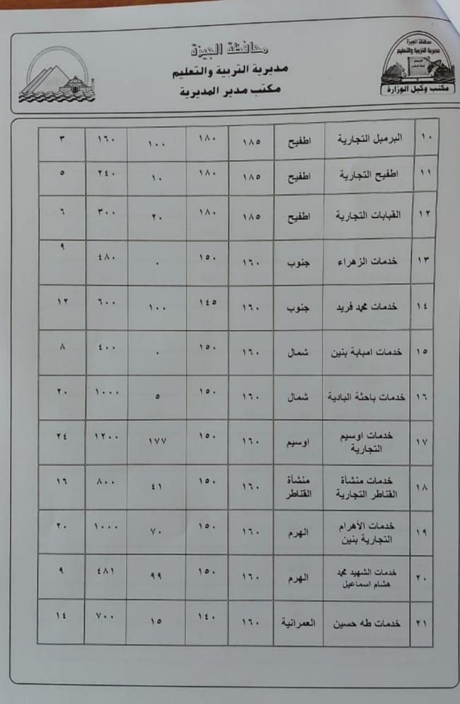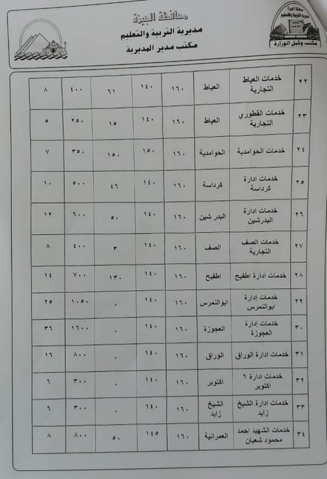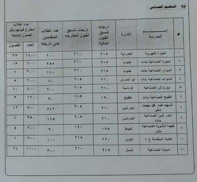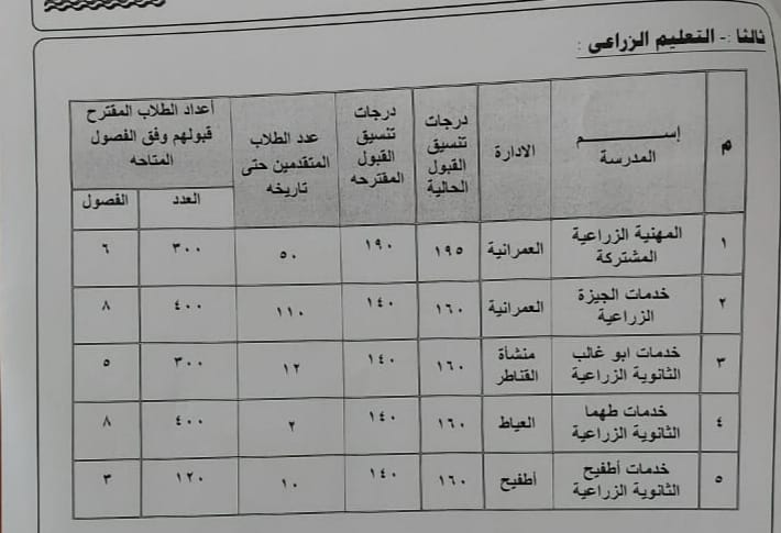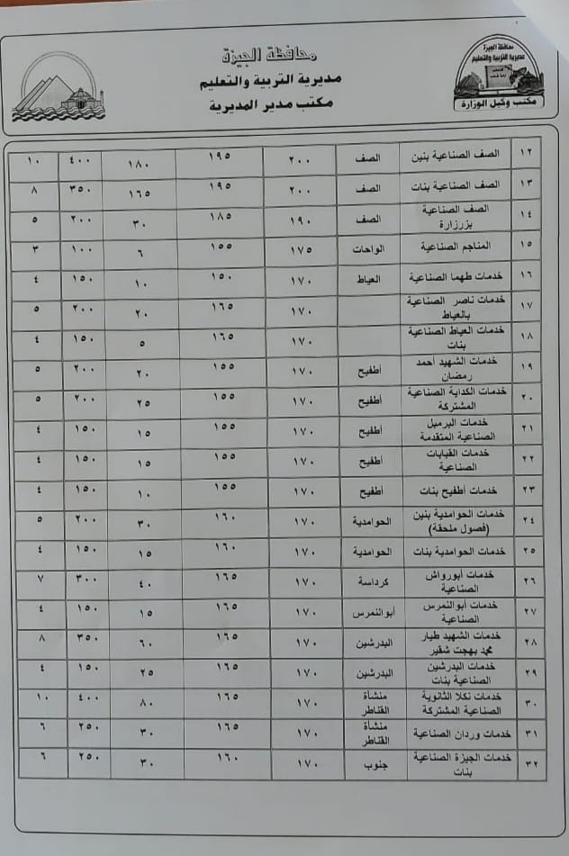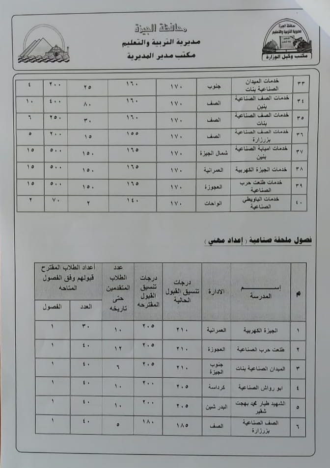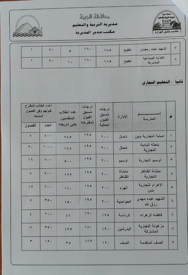 كما قرر محافظ الجيزة تخفيض القبول بمدارس التعليم الصناعي والزراعي والتجاري وذلك وفقا للكشوف المرفقة والتي تضم المدارس وتنسيق القبول الخاص بكلا منها.