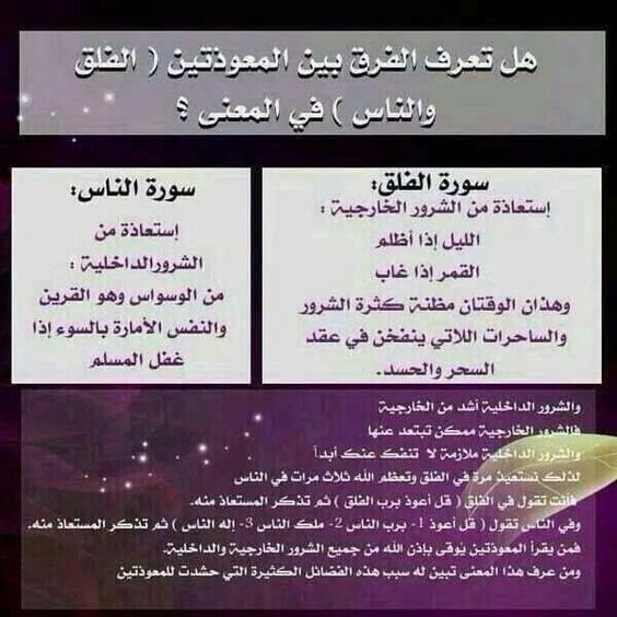 وقال عُقْبةَ بنِ عامرٍ رضيَ الله عنه، أنه لقي النبي صلى الله عليه وسلم، فقال له النبي: "يا عُقْبةُ بنَ عامِرٍ، ألَا أُعَلِّمُك سوَرًا ما أُنزِلَتْ في التَّوراةِ، ولا في الزَّبورِ، ولا في الإنجيلِ، ولا في الفُرقانِ مِثلُهُنَّ؟ لا يأتِيَنَّ عليك لَيلةٌ إلَّا قَرأْتَهُنَّ فيها: قُلْ هُوَ اللَّهُ أَحَدٌ، وقُلْ أَعُوذُ بِرَبِّ الْفَلَقِ، وقُلْ أَعُوذُ بِرَبِّ النَّاسِ". قال عُقْبةُ: "فما أَتَتْ علَيَّ لَيلةٌ إلَّا قَرأْتُهُنَّ فيها، وحُقَّ لي ألَّا أَدَعَهُنَّ وقد أَمَرَني بهِنَّ رسولُ اللهِ صلَّى اللهُ عليه وسلَّم).